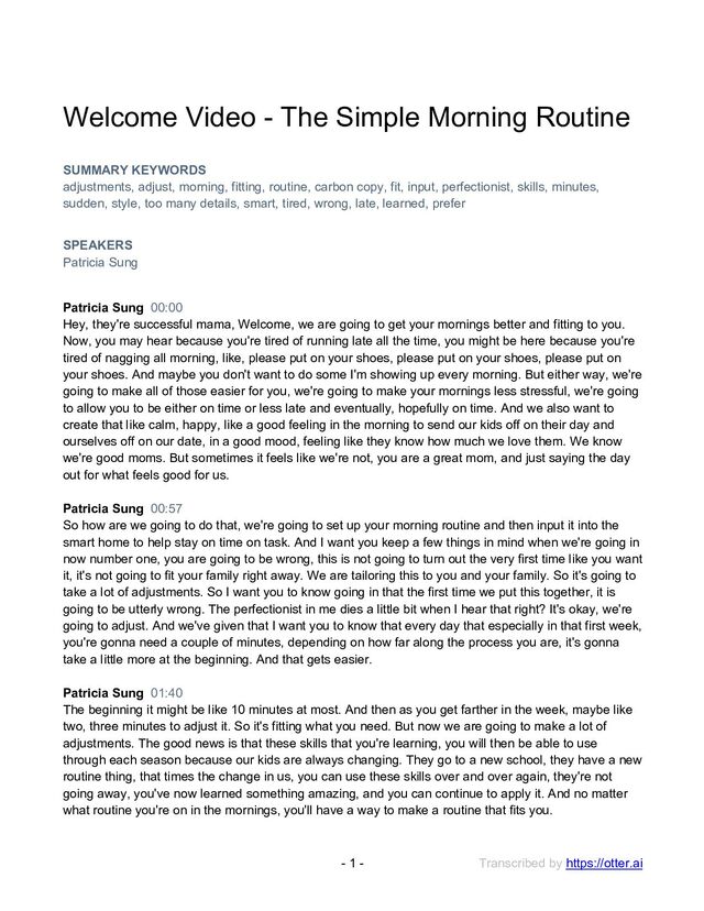 Simple Morning Routine SUMMARY KEYWORDS adjustments, adjust, morning, fitting, routine, carbon copy, fit, input, perfectionist, skills, minutes, sudden, style, too many details, smart, tired, wrong, late, learned, prefer SPEAKERS Patricia Sung Patricia Sung 00:00 Hey, they're successful mama, Welcome, we are going to get your mornings better and fitting to you. Now, you may hear because you're tired of running late all the time, you might be here because you're tired of nagging all morning, like, please put on your shoes, please put on your shoes, please put on your shoes. And maybe you don't want to do some I'm showing up every morning. But either way, we're going to make all of those easier for you, we're going to make your mornings less stressful, we're going to allow you to be either on time or less late and eventually, hopefully on time. And we also want to create that like calm, happy, like a good feeling in the morning to send our kids off on their day and ourselves off on our date, in a good mood, feeling like they know how much we love them. We know we're good moms. But sometimes it feels like we're not, you are a great mom, and just saying the day out for what feels good for us. Patricia Sung 00:57 So how are we going to do that, we're going to set up your morning routine and then input it into the smart home to help stay on time on task. And I want you keep a few things in mind when we're going in now number one, you are going to be wrong, this is not going to turn out the very first time like you want it, it's not going to fit your family right away. We are tailoring this to you and your family. So it's going to take a lot of adjustments. So I want you to know going in that the first time we put this together, it is going to be utterly wrong. The perfectionist in me dies a little bit when I hear that right? It's okay, we're going to adjust. And we've given that I want you to know that every day that especially in that first week, you're gonna need a couple of minutes, depending on how far along the process you are, it's gonna take a little more at the beginning. And that gets easier. Patricia Sung 01:40 The beginning it might be like 10 minutes at most. And then as you get farther in the week, maybe like two, three minutes to adjust it. So it's fitting what you need. But now we are going to make a lot of adjustments. The good news is that these skills that you're learning, you will then be able to use through each season because our kids are always changing. They go to a new school, they have a new routine thing, that times the change in us, you can use these skills over and over again, they're not going away, you've now learned something amazing, and you can continue to apply it. And no matter what routine you're on in the mornings, you'll have a way to make a routine that fits you.