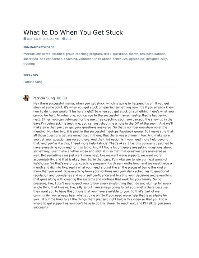 2023 2:57PM 2:14 SUMMARY KEYWORDS meetup, answered, routines, group coaching program, stuck, questions, month, dm, post, patricia, successful, self confidence, coaching, volunteer, third option, schedules, lighthouse, designed, silly, trusting SPEAKERS Patricia Sung Patricia Sung 00:00 Hey there successful mama, when you get stuck, which is going to happen, it's on. If you get stuck at some point, it's when you get stuck or learning something new. It's if you already knew how to do it, you wouldn't be here, right? So when you get stuck on something, here's what you can do for help. Number one, you can go to the successful mama meetup that is happening next. Either, you can volunteer for the next free coaching spot, you can add the show up in the days I'm doing ask me anything, you can just shoot me a note in the DM of the zoom. And we'll make sure that you can get your questions answered. So that's number one show up at the meeting. Number two, it is post in the successful meetups Facebook group. So I make sure that all those questions get answered post in there, that there was a chime in too. And make sure you get your question answered there. And the third option is if you need more help beyond that, and you're like this, I need more help Patricia. That's okay. Like, this course is designed to have everything you need for this topic. And if I find a lot of people are asking questions about something, I just make another video and stick it in so that that question gets answered as well. But sometimes we just want more help, like we want more support, we want more accountability, and that is okay, too. So, in that case, I'd invite you to join our next group of lighthouse. So that's my group coaching program. It's three months long, and we meet twice a month and dig into like, really what you need around like all the pieces of being the kind of mom that you want. So everything from your routines and your daily schedules to emotional regulation and boundaries and your self confidence and trusting your decisions and everything that goes along with creating the systems and routines that work for your family. So no pressure, like, I don't ever expect you to buy every single thing that I do and sign up for every single thing that I make, like, silly so but I am always going to tell you what's there because they want you to have the options that you have available to you. So that's part of my community. You always hear what's going on. So if you need more help that is available for you. I'll put the links to all the things that I just said right below this video so that you know where to get support us you don't have to do this alone. So reach out, and I'll talk to you soon successful