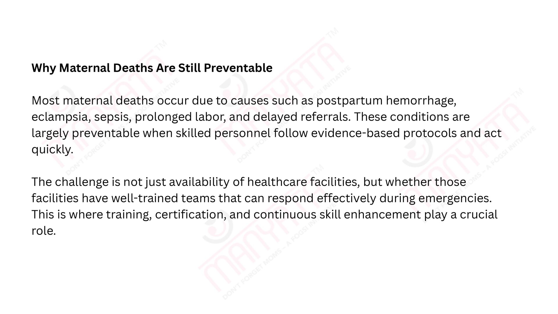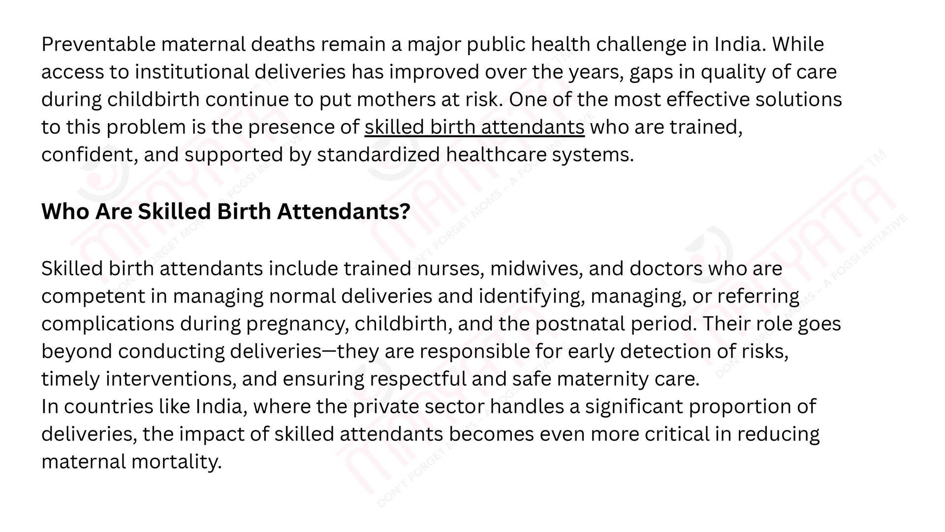 Preventable maternal deaths remain a major public health challenge in India. While access to institutional deliveries has improved over the years, gaps in quality of care during childbirth continue to put mothers at risk. One of the most effective solutions to this problem is the presence of skilled birth attendants who are trained, confident, and supported by standardized healthcare systems.