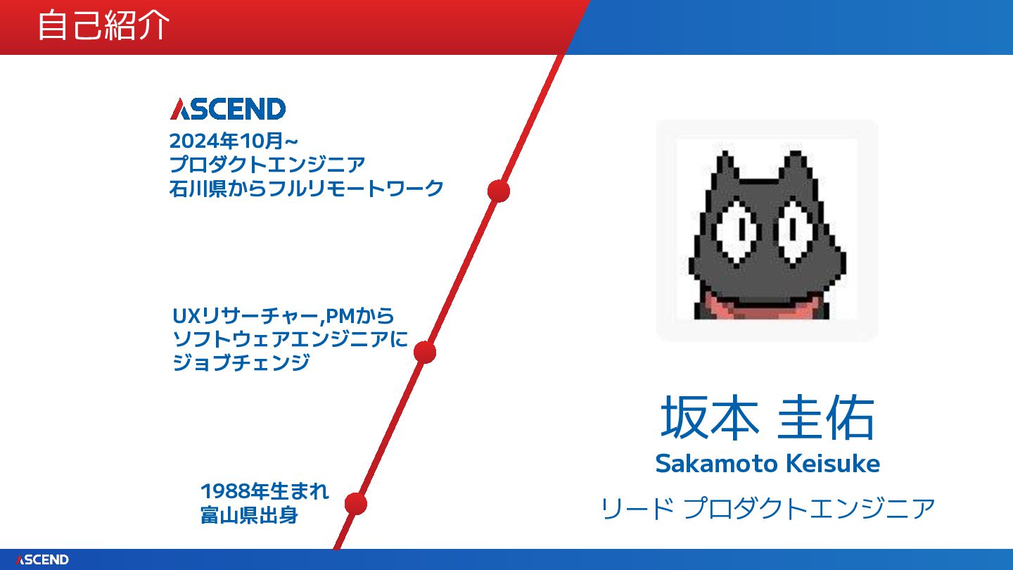 自己紹介 1988年生まれ 富山県出身 UXリサーチャー,PMから ソフトウェアエンジニアに ジョブチェンジ 2024年10月~ プロダクトエンジニア 石川県からフルリモートワーク 自己紹介