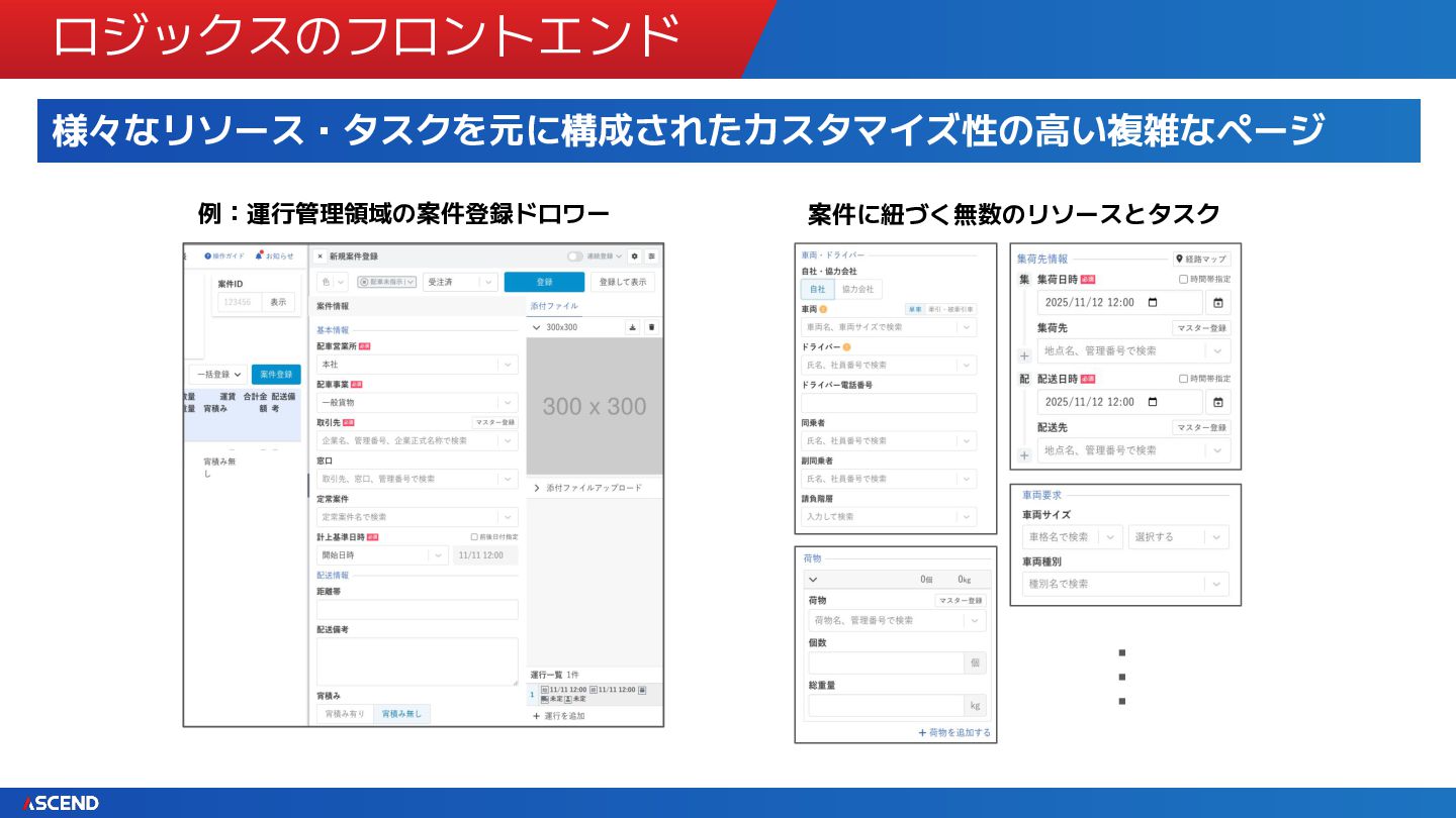 ロジックスのフロントエンド 例:運行管理領域の案件登録ドロワー 様々なリソース・タスクを元に構成されたカスタマイズ性の高い複雑なページ 案件に紐づく無数のリソースとタスク