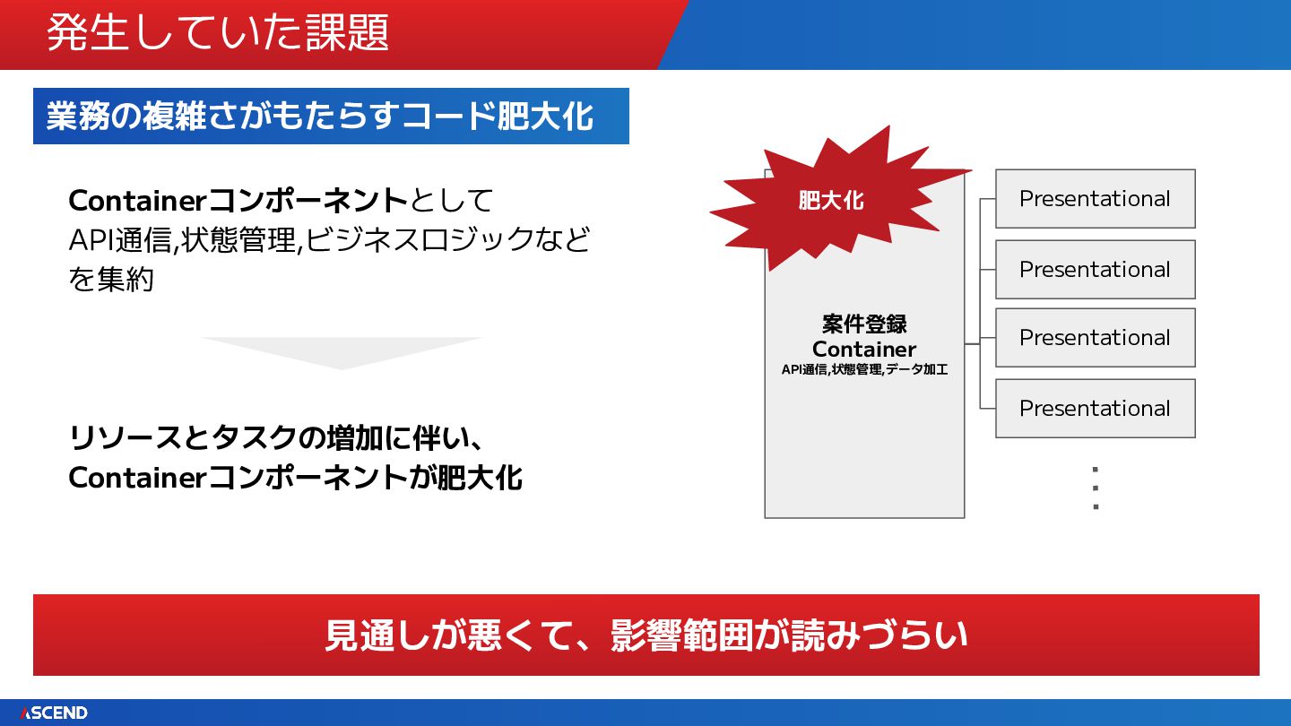 発生していた課題 見通しが悪くて、影響範囲が読みづらい Containerコンポーネントとして API通信,状態管理,ビジネスロジックなど を集約 リソースとタスクの増加に伴い、 Containerコンポーネントが肥大化 案件登録 Container API通信,状態管理,データ加工
