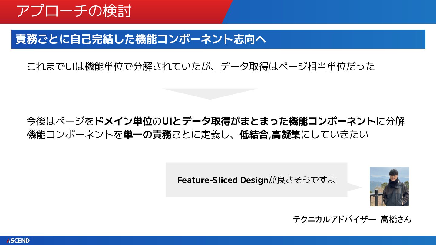 アプローチの検討 これまでUIは機能単位で分解されていたが、データ取得はページ相当単位だった テクニカルアドバイザー 高橋さん Feature-Sliced Designが良さそうですよ 責務ごとに自己完結した機能コンポーネント志向へ 今後はページをドメイン単位のUIとデータ取得がまとまった機能コンポーネントに分解 機能コンポーネントを単一の責務ごとに定義し、低結合,高凝集にしていきたい