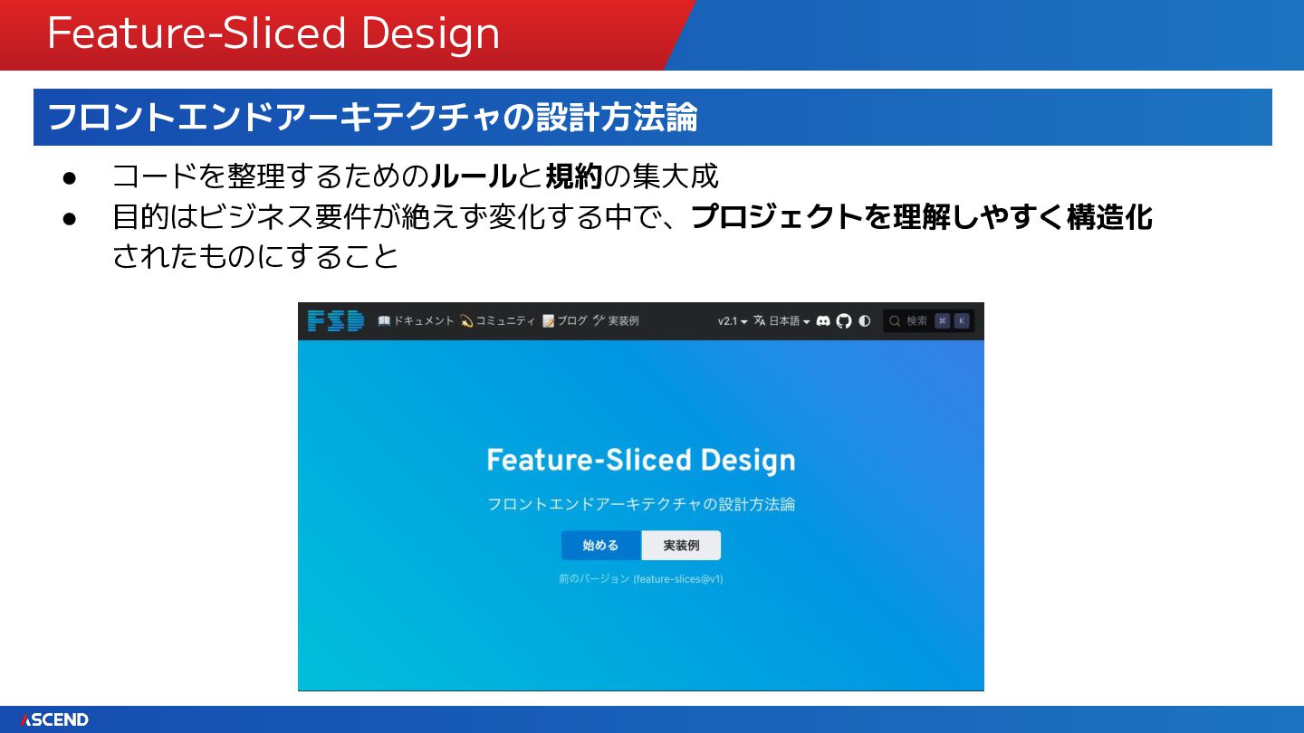 Feature-Sliced Design • コードを整理するためのルールと規約の集大成 • 目的はビジネス要件が絶えず変化する中で、プロジェクトを理解しやすく構造化 されたものにすること フロントエンドアーキテクチャの設計方法論