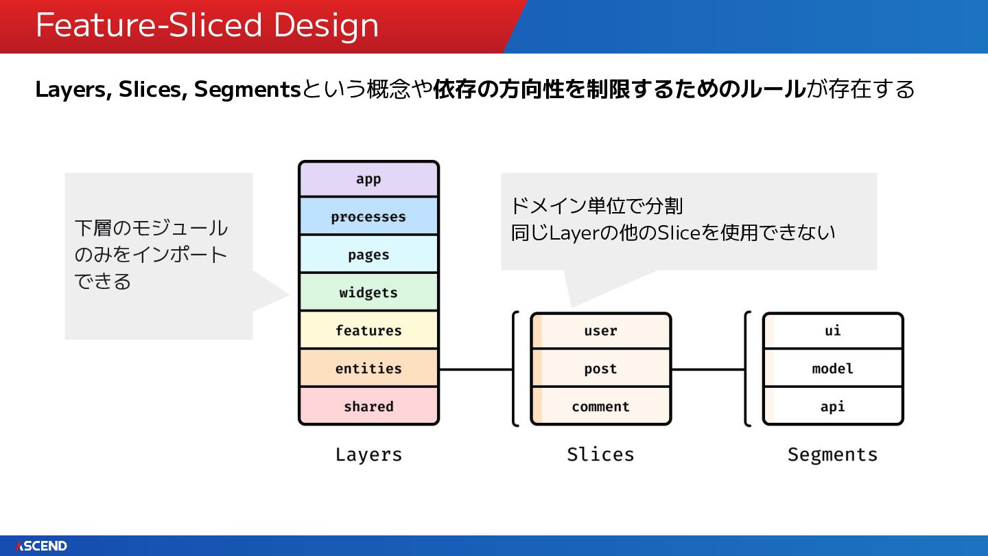 Feature-Sliced Design Layers, Slices, Segmentsという概念や依存の方向性を制限するためのルールが存在する ドメイン単位で分割 同じLayerの他のSliceを使用できない 下層のモジュール のみをインポート できる