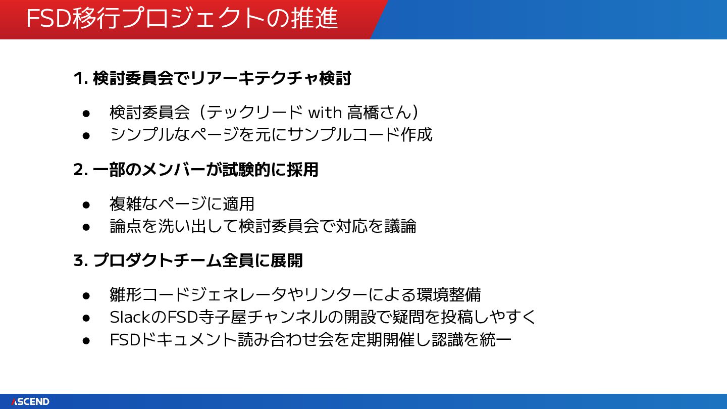 FSD移行プロジェクトの推進 1. 検討委員会でリアーキテクチャ検討 • 検討委員会(テックリード with 高橋さん) • シンプルなページを元にサンプルコード作成 2.