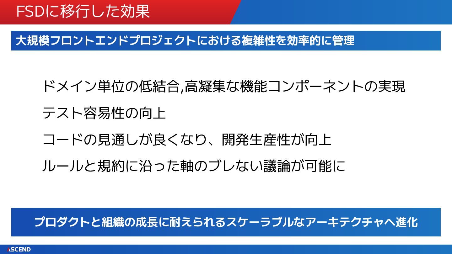 FSDに移行した効果 ドメイン単位の低結合,高凝集な機能コンポーネントの実現 テスト容易性の向上 コードの見通しが良くなり、開発生産性が向上 ルールと規約に沿った軸のブレない議論が可能に 大規模フロントエンドプロジェクトにおける複雑性を効率的に管理 プロダクトと組織の成長に耐えられるスケーラブルなアーキテクチャへ進化