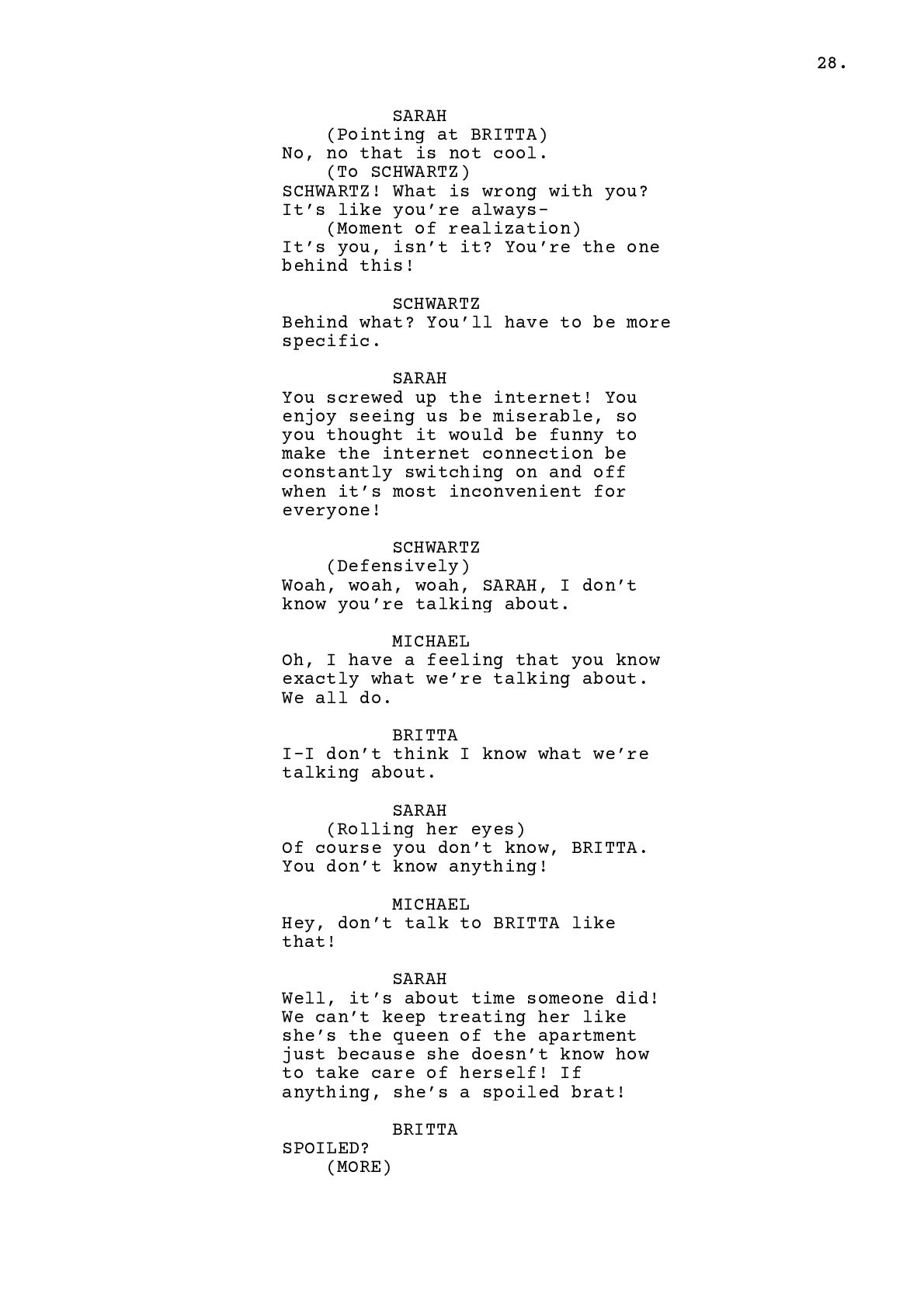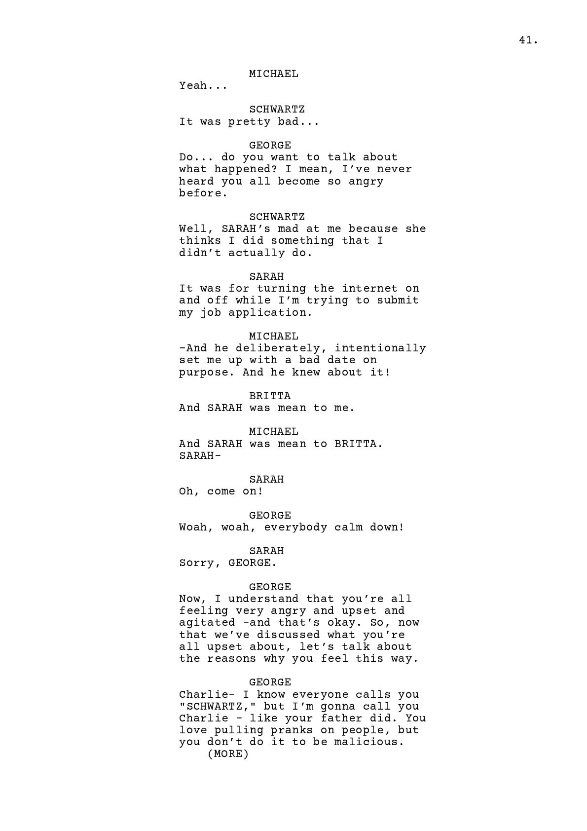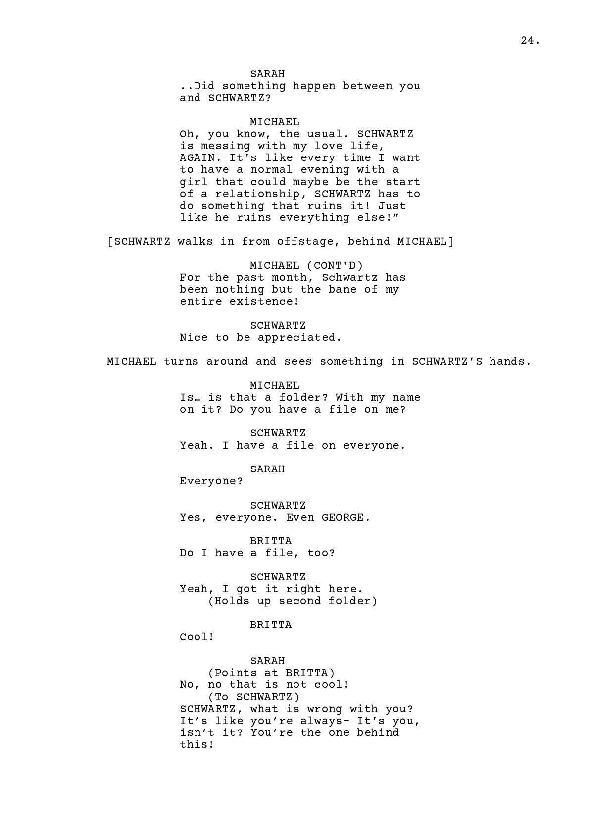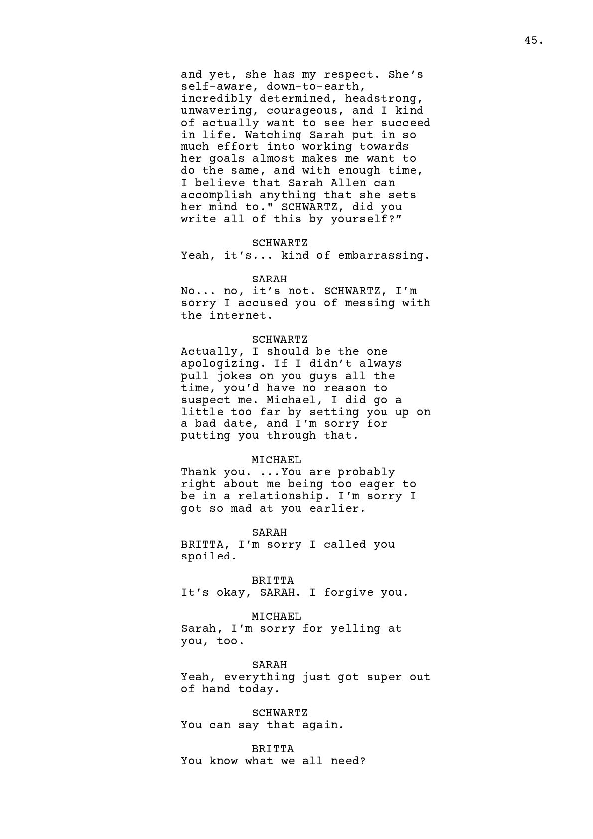 determined, headstrong, unwavering, courageous, and I kind of actually want to see her succeed in life. Watching Sarah put in so much effort into working towards her goals almost makes me want to do the same, and with enough time, I believe that Sarah Allen can accomplish anything that she sets her mind to." SCHWARTZ, did you write all of this by yourself?” SCHWARTZ Yeah, it’s... kind of embarrassing. SARAH No... no, it’s not. SCHWARTZ, I’m sorry I accused you of messing with the internet. SCHWARTZ Actually, I should be the one apologizing. If I didn’t always pull jokes on you guys all the time, you’d have no reason to suspect me. Michael, I did go a little too far by setting you up on a bad date, and I’m sorry for putting you through that. MICHAEL Thank you. ...You are probably right about me being too eager to be in a relationship. I’m sorry I got so mad at you earlier. SARAH BRITTA, I’m sorry I called you spoiled. BRITTA It’s okay, SARAH. I forgive you. MICHAEL Sarah, I’m sorry for yelling at you, too. SARAH Yeah, everything just got super out of hand today. SCHWARTZ You can say that again. BRITTA You know what we all need? SARAH 45.