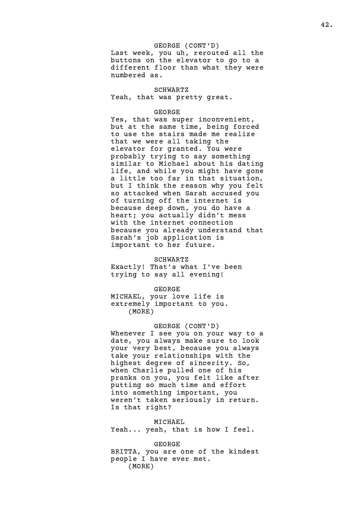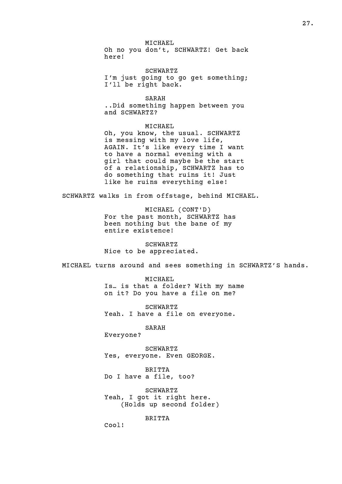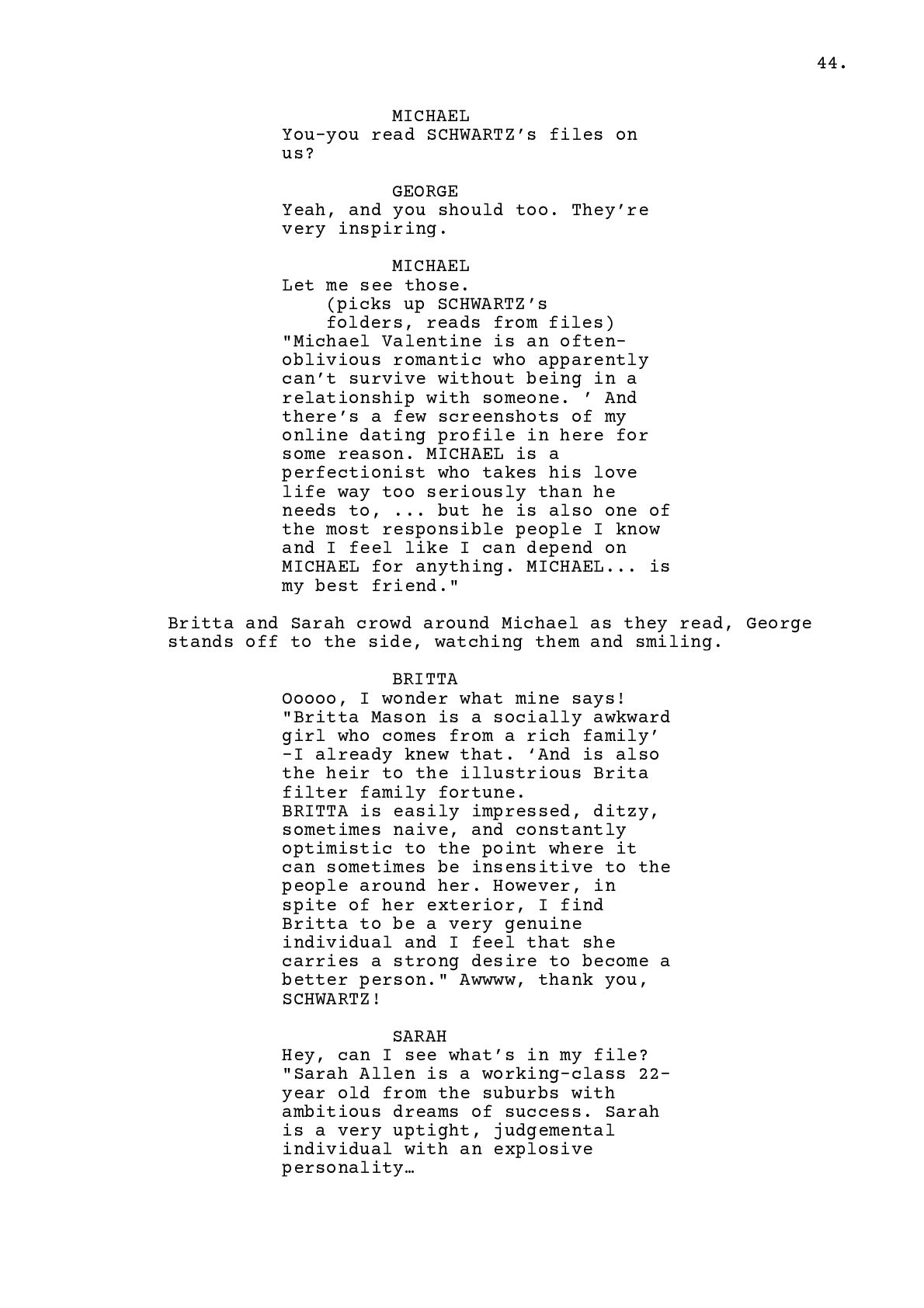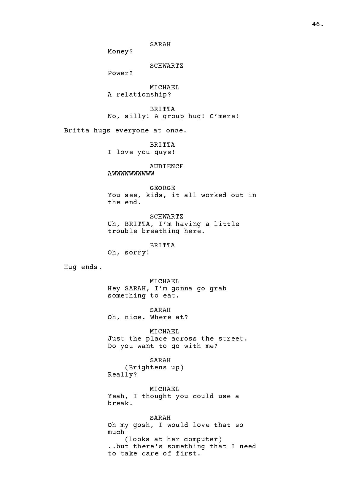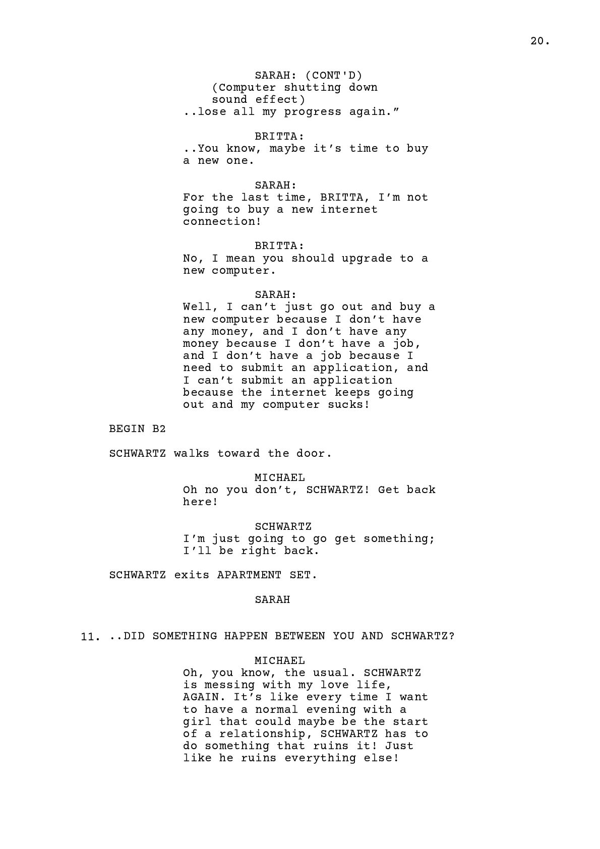 determined, headstrong, unwavering, courageous, and I kind of actually want to see her succeed in life. Watching Sarah put in so much effort into working towards her goals almost makes me want to do the same, and with enough time, I believe that Sarah Allen can accomplish anything that she sets her mind to." SCHWARTZ, did you write all of this by yourself?” SCHWARTZ Yeah, it’s... kind of embarrassing. SARAH No... no, it’s not. SCHWARTZ, I’m sorry I accused you of messing with the internet. SCHWARTZ Actually, I should be the one apologizing. If I didn’t always pull jokes on you guys all the time, you’d have no reason to suspect me. Michael, I did go a little too far by setting you up on a bad date, and I’m sorry for putting you through that. MICHAEL Thank you. ...You are probably right about me being too eager to be in a relationship. I’m sorry I got so mad at you earlier. SARAH BRITTA, I’m sorry I called you spoiled. BRITTA It’s okay, SARAH. I forgive you. MICHAEL Sarah, I’m sorry for yelling at you, too. SARAH Yeah, everything just got super out of hand today. SCHWARTZ You can say that again. BRITTA You know what we all need? SARAH 45.