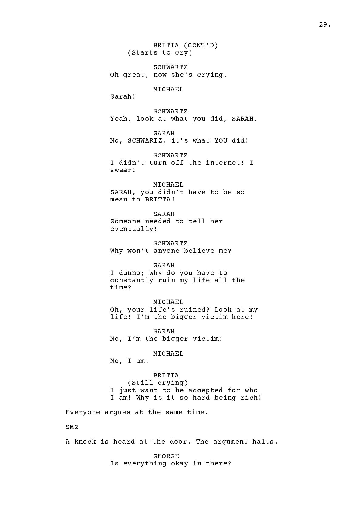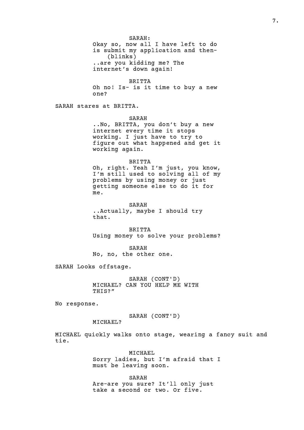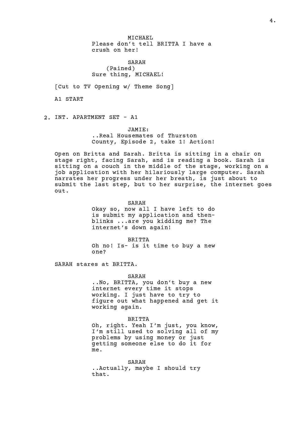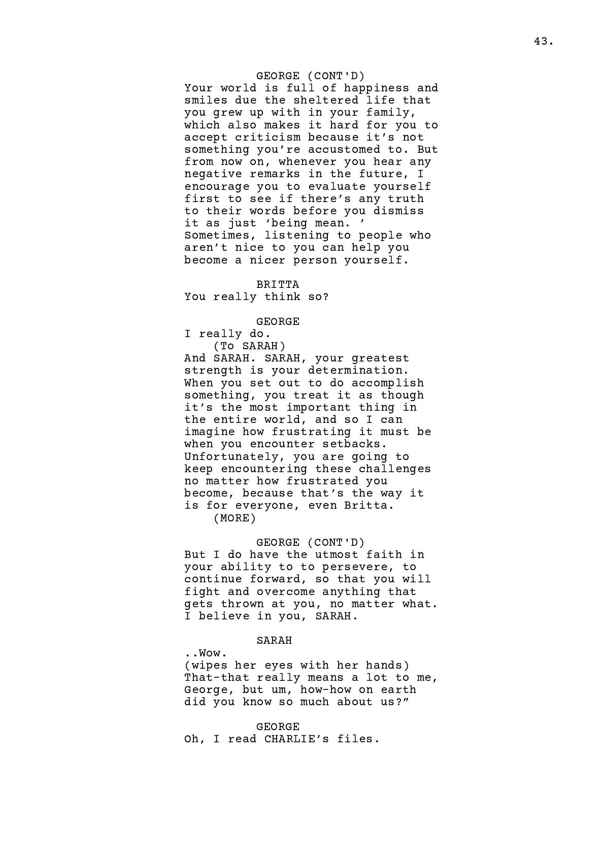determined, headstrong, unwavering, courageous, and I kind of actually want to see her succeed in life. Watching Sarah put in so much effort into working towards her goals almost makes me want to do the same, and with enough time, I believe that Sarah Allen can accomplish anything that she sets her mind to." SCHWARTZ, did you write all of this by yourself?” SCHWARTZ Yeah, it’s... kind of embarrassing. SARAH No... no, it’s not. SCHWARTZ, I’m sorry I accused you of messing with the internet. SCHWARTZ Actually, I should be the one apologizing. If I didn’t always pull jokes on you guys all the time, you’d have no reason to suspect me. Michael, I did go a little too far by setting you up on a bad date, and I’m sorry for putting you through that. MICHAEL Thank you. ...You are probably right about me being too eager to be in a relationship. I’m sorry I got so mad at you earlier. SARAH BRITTA, I’m sorry I called you spoiled. BRITTA It’s okay, SARAH. I forgive you. MICHAEL Sarah, I’m sorry for yelling at you, too. SARAH Yeah, everything just got super out of hand today. SCHWARTZ You can say that again. BRITTA You know what we all need? SARAH 45.