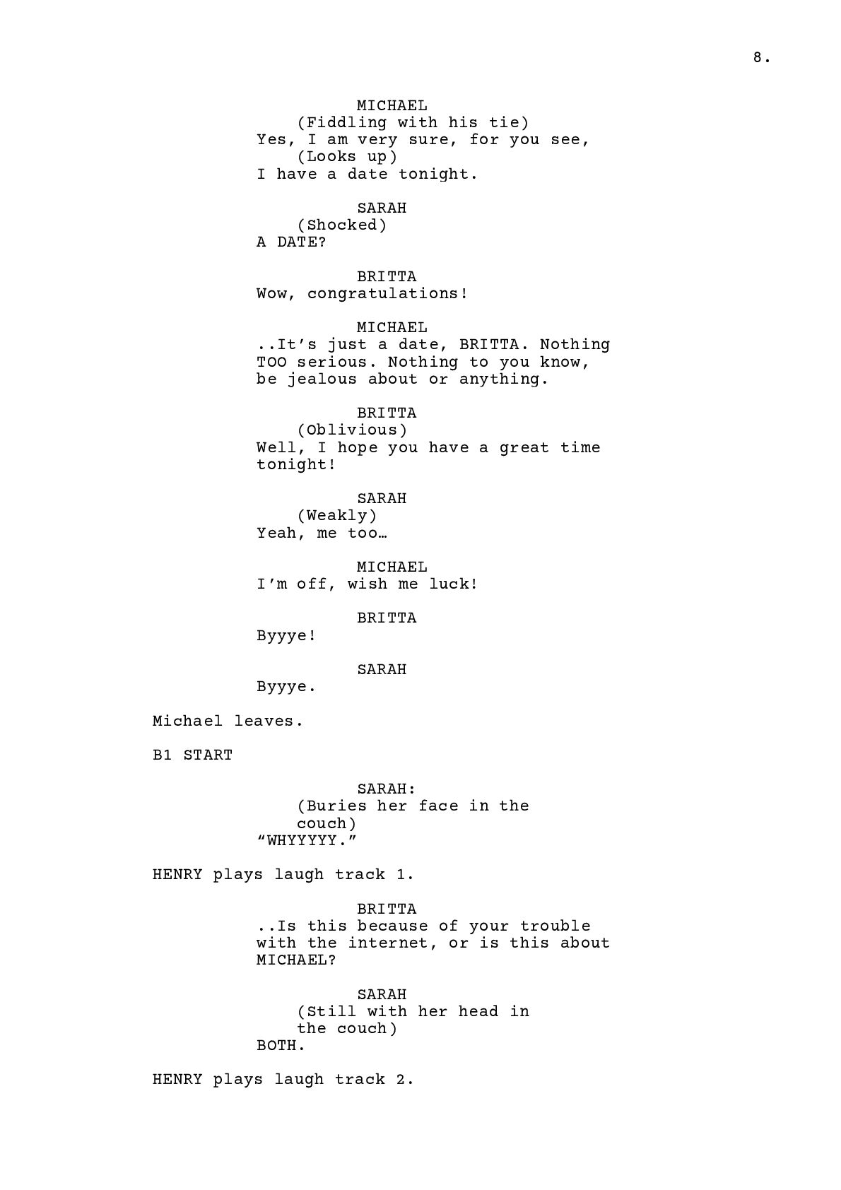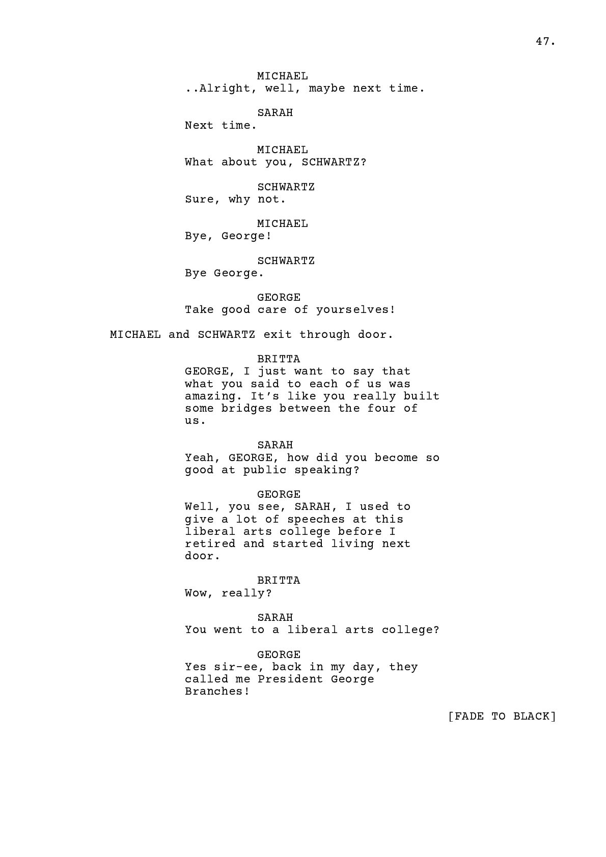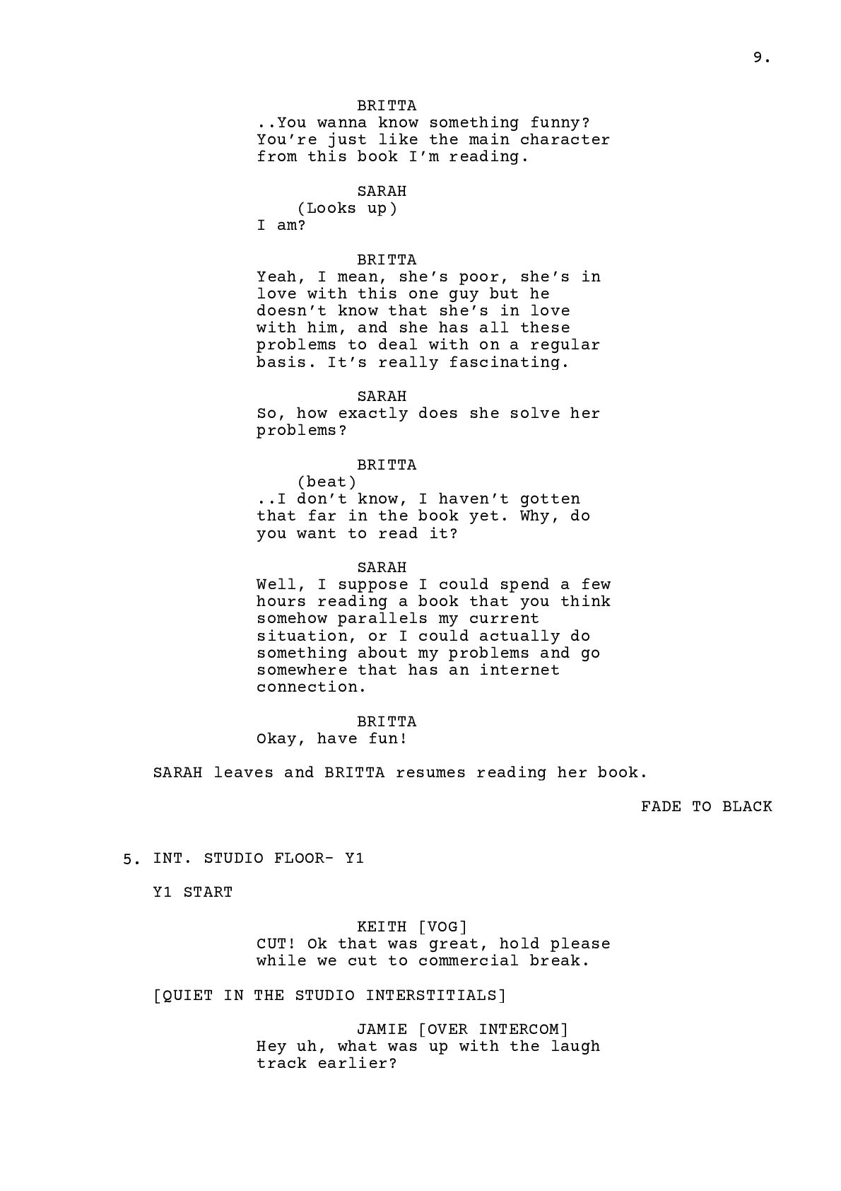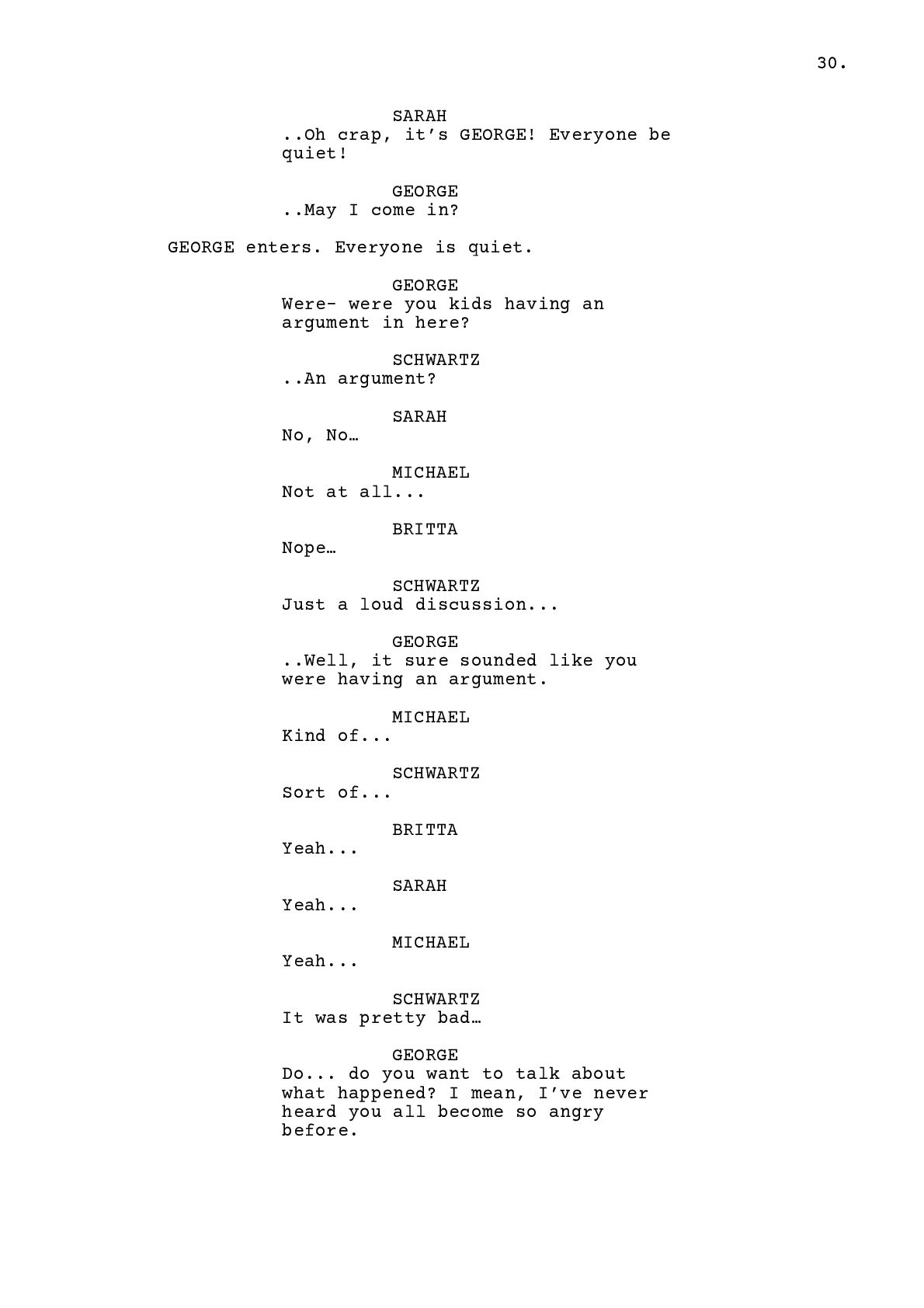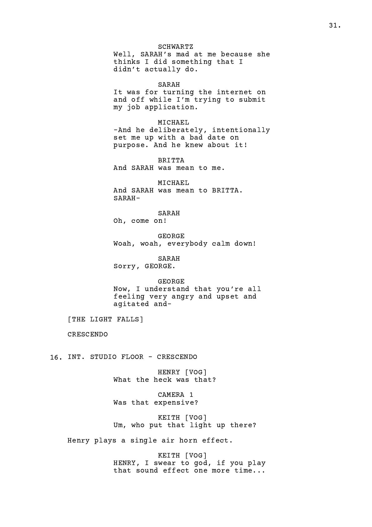 determined, headstrong, unwavering, courageous, and I kind of actually want to see her succeed in life. Watching Sarah put in so much effort into working towards her goals almost makes me want to do the same, and with enough time, I believe that Sarah Allen can accomplish anything that she sets her mind to." SCHWARTZ, did you write all of this by yourself?” SCHWARTZ Yeah, it’s... kind of embarrassing. SARAH No... no, it’s not. SCHWARTZ, I’m sorry I accused you of messing with the internet. SCHWARTZ Actually, I should be the one apologizing. If I didn’t always pull jokes on you guys all the time, you’d have no reason to suspect me. Michael, I did go a little too far by setting you up on a bad date, and I’m sorry for putting you through that. MICHAEL Thank you. ...You are probably right about me being too eager to be in a relationship. I’m sorry I got so mad at you earlier. SARAH BRITTA, I’m sorry I called you spoiled. BRITTA It’s okay, SARAH. I forgive you. MICHAEL Sarah, I’m sorry for yelling at you, too. SARAH Yeah, everything just got super out of hand today. SCHWARTZ You can say that again. BRITTA You know what we all need? SARAH 45.