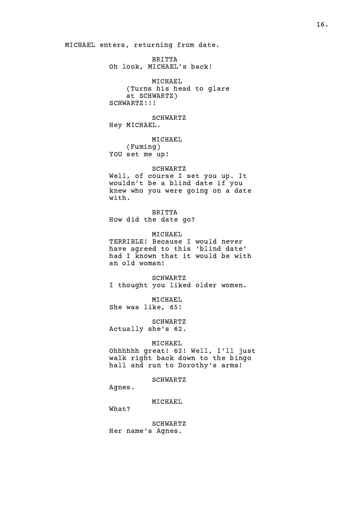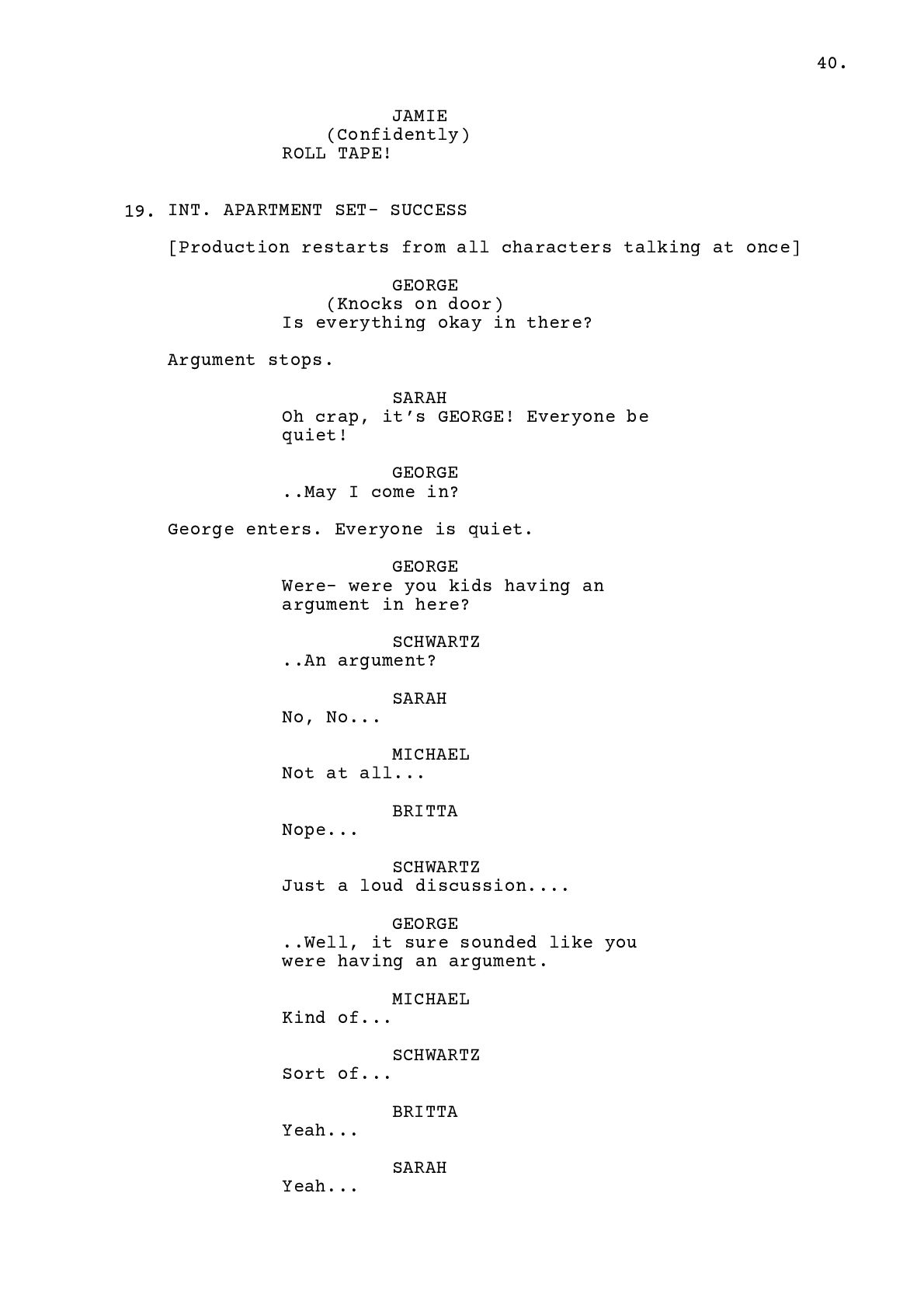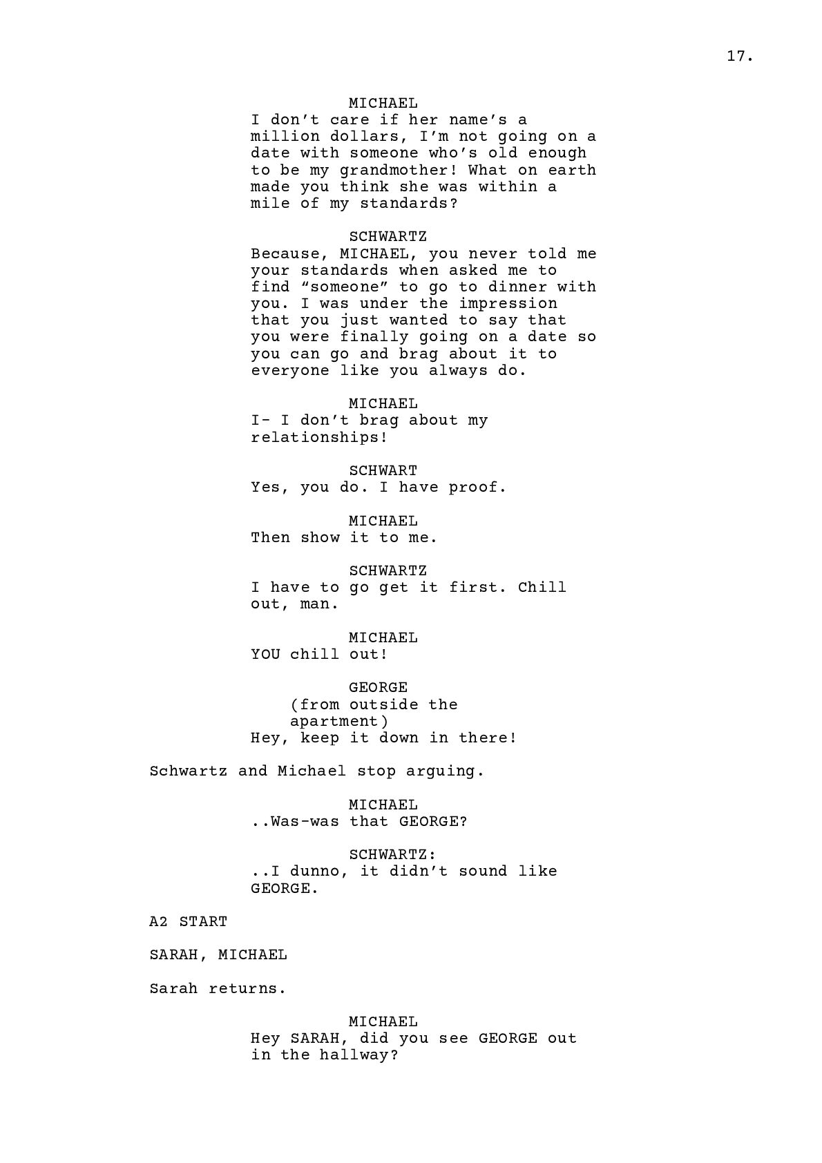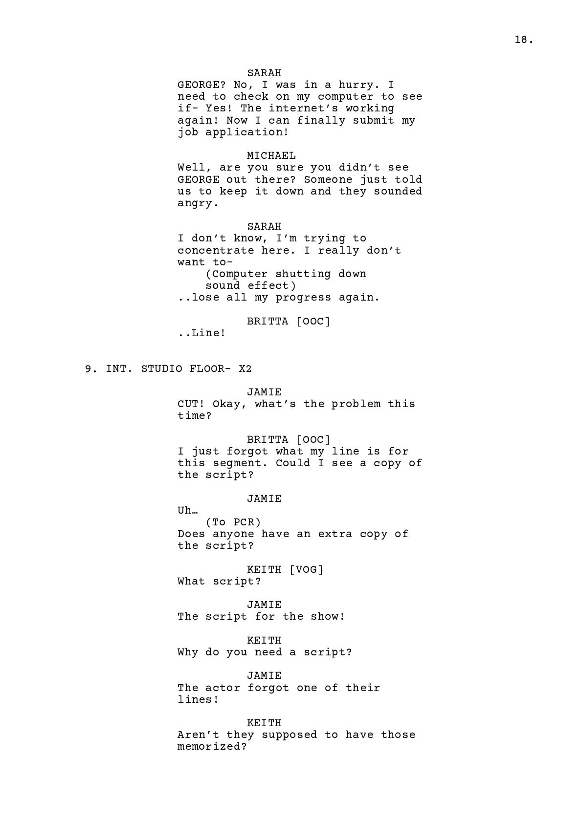 determined, headstrong, unwavering, courageous, and I kind of actually want to see her succeed in life. Watching Sarah put in so much effort into working towards her goals almost makes me want to do the same, and with enough time, I believe that Sarah Allen can accomplish anything that she sets her mind to." SCHWARTZ, did you write all of this by yourself?” SCHWARTZ Yeah, it’s... kind of embarrassing. SARAH No... no, it’s not. SCHWARTZ, I’m sorry I accused you of messing with the internet. SCHWARTZ Actually, I should be the one apologizing. If I didn’t always pull jokes on you guys all the time, you’d have no reason to suspect me. Michael, I did go a little too far by setting you up on a bad date, and I’m sorry for putting you through that. MICHAEL Thank you. ...You are probably right about me being too eager to be in a relationship. I’m sorry I got so mad at you earlier. SARAH BRITTA, I’m sorry I called you spoiled. BRITTA It’s okay, SARAH. I forgive you. MICHAEL Sarah, I’m sorry for yelling at you, too. SARAH Yeah, everything just got super out of hand today. SCHWARTZ You can say that again. BRITTA You know what we all need? SARAH 45.