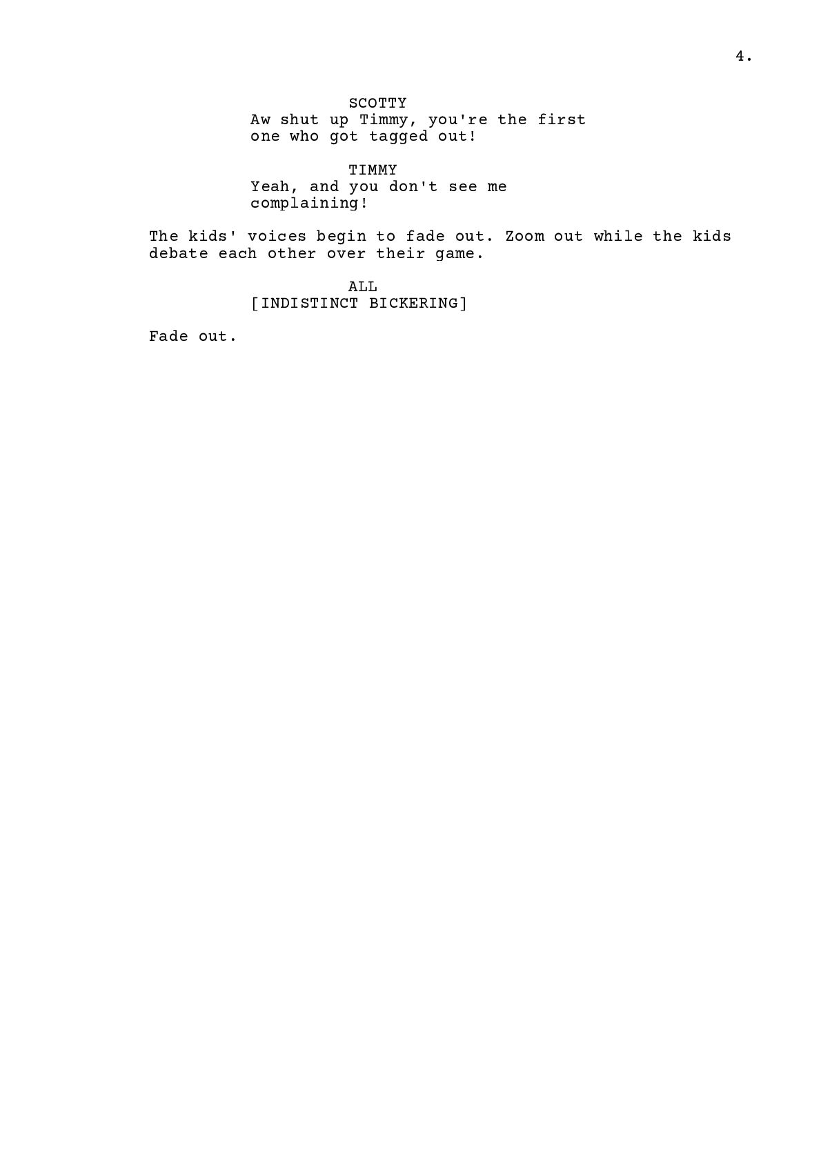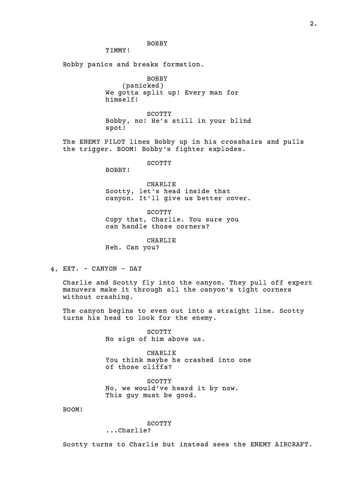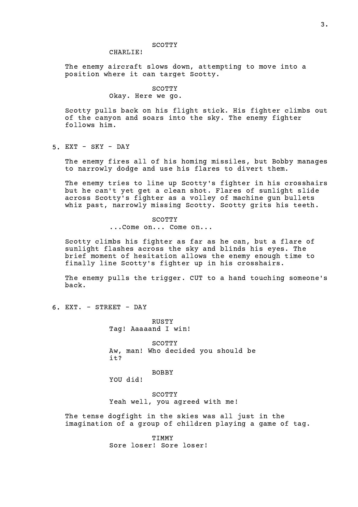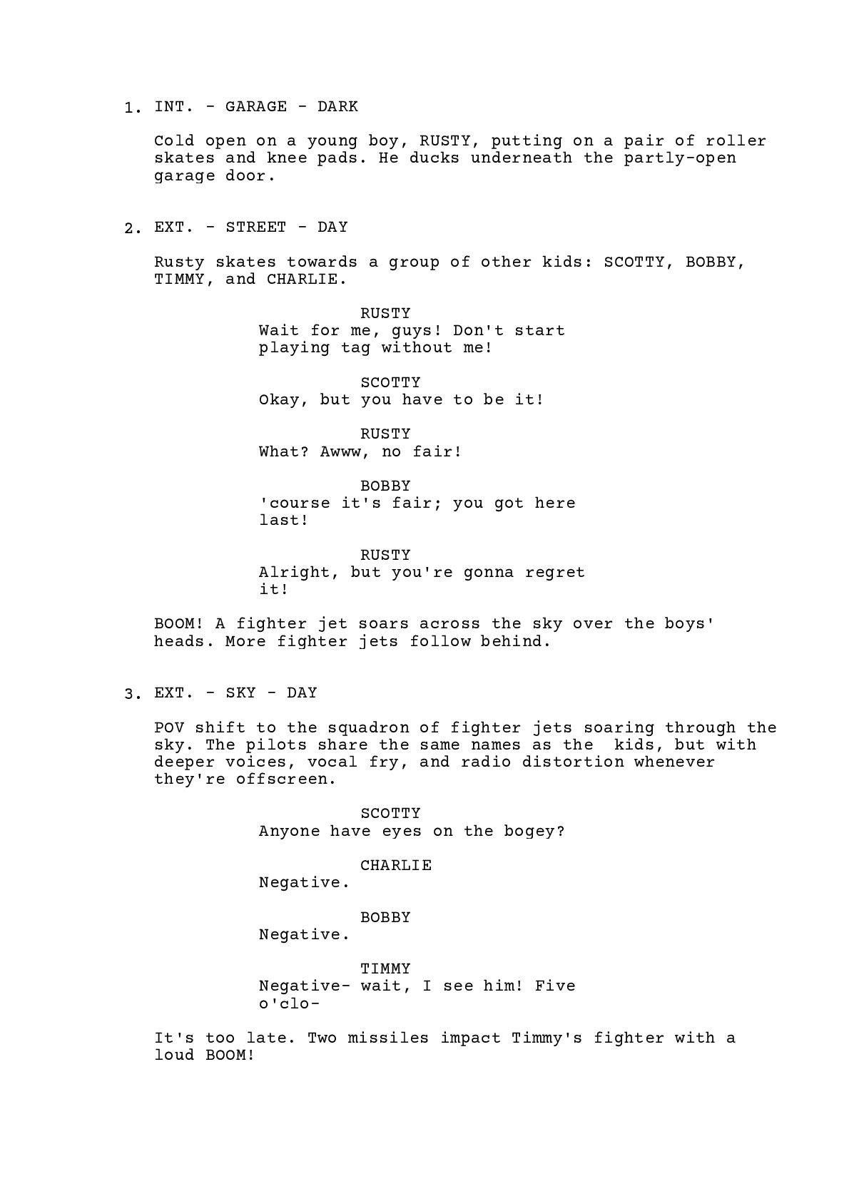 boy, RUSTY, putting on a pair of roller skates and knee pads. He ducks underneath the partly-open garage door. EXT. - STREET - DAY Rusty skates towards a group of other kids: SCOTTY, BOBBY, TIMMY, and CHARLIE. RUSTY Wait for me, guys! Don't start playing tag without me! SCOTTY Okay, but you have to be it! RUSTY What? Awww, no fair! BOBBY 'course it's fair; you got here last! RUSTY Alright, but you're gonna regret it! BOOM! A fighter jet soars across the sky over the boys' heads. More fighter jets follow behind. EXT. - SKY - DAY POV shift to the squadron of fighter jets soaring through the sky. The pilots share the same names as the kids, but with deeper voices, vocal fry, and radio distortion whenever they're offscreen. SCOTTY Anyone have eyes on the bogey? CHARLIE Negative. BOBBY Negative. TIMMY Negative- wait, I see him! Five o'clo- It's too late. Two missiles impact Timmy's fighter with a loud BOOM! BOBBY 1. 2. 3.