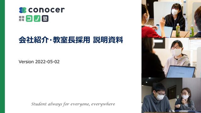 当たり前や現状維持を疑おう。 目的を達成するベストな選択肢を考え、 議論し尽くし、正しい行動を取ろう。 議論は大切にしながらも、 顧客・社会に実際に価値を届けよう。 「実行してこそ価値を生む」のだから やり切ることに徹底してこだわろう。 生徒の未来を信じ、実際の生徒、 具体的なN=1の課題を解きにいこう。 私たちの作るサービスは、私たちの よく知る「その子」に真っ先に届けよう。 チームで価値を生むのがコノセル流。 互いに敬意を持ち、強みを活かし合い、 健全な関係性でそれぞれの役割を 気持ちよく全うして、大きな価値を生もう。 生徒中心のサービス開発・教室運営のための価値観を共有