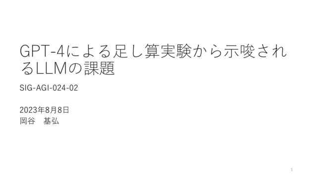 GPT-4による足し算実験から示唆され るLLMの課題 SIG-AGI-024-02 2023年8月8日 岡谷 基弘 1