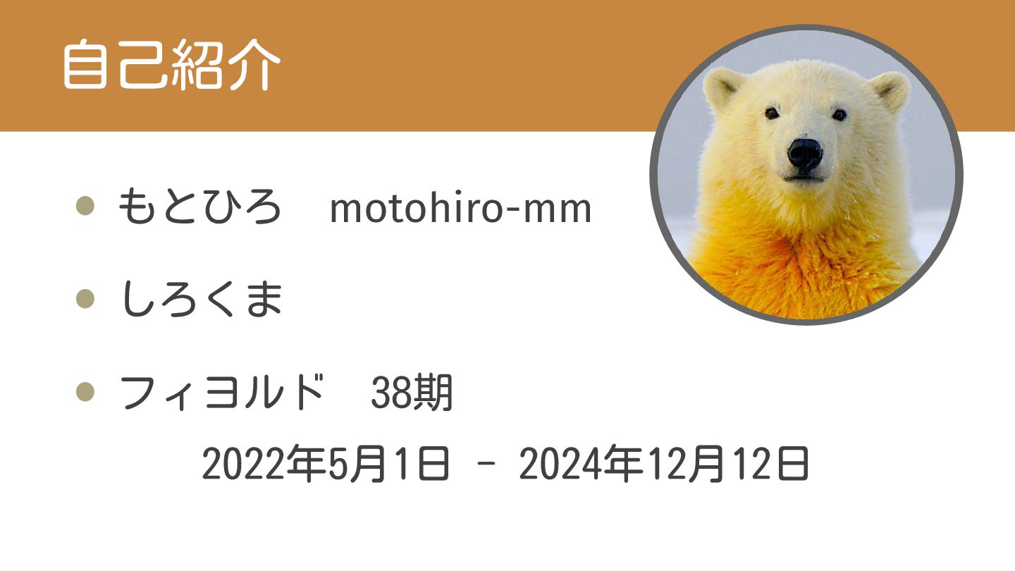 自己紹介 もとひろ motohiro-mm しろくま フィヨルド 38期 2022年5月1日 - 2024年12月12日
