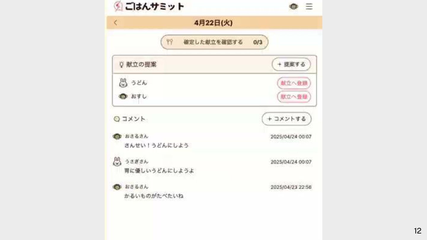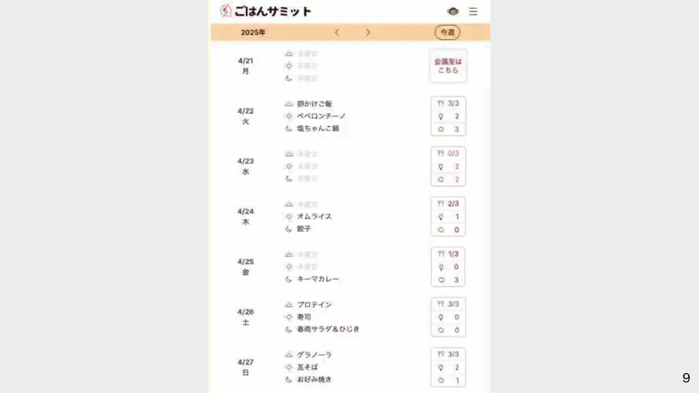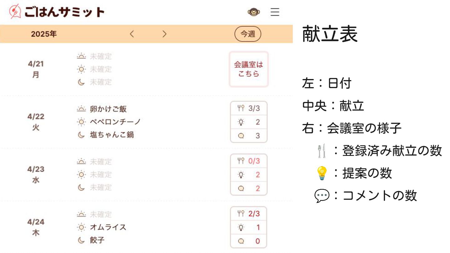 左:日付 中央:献立 右:会議室の様子 🍴:登録済み献立の数 💡:提案の数 💬:コメントの数 献立表