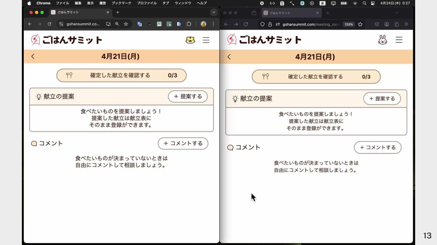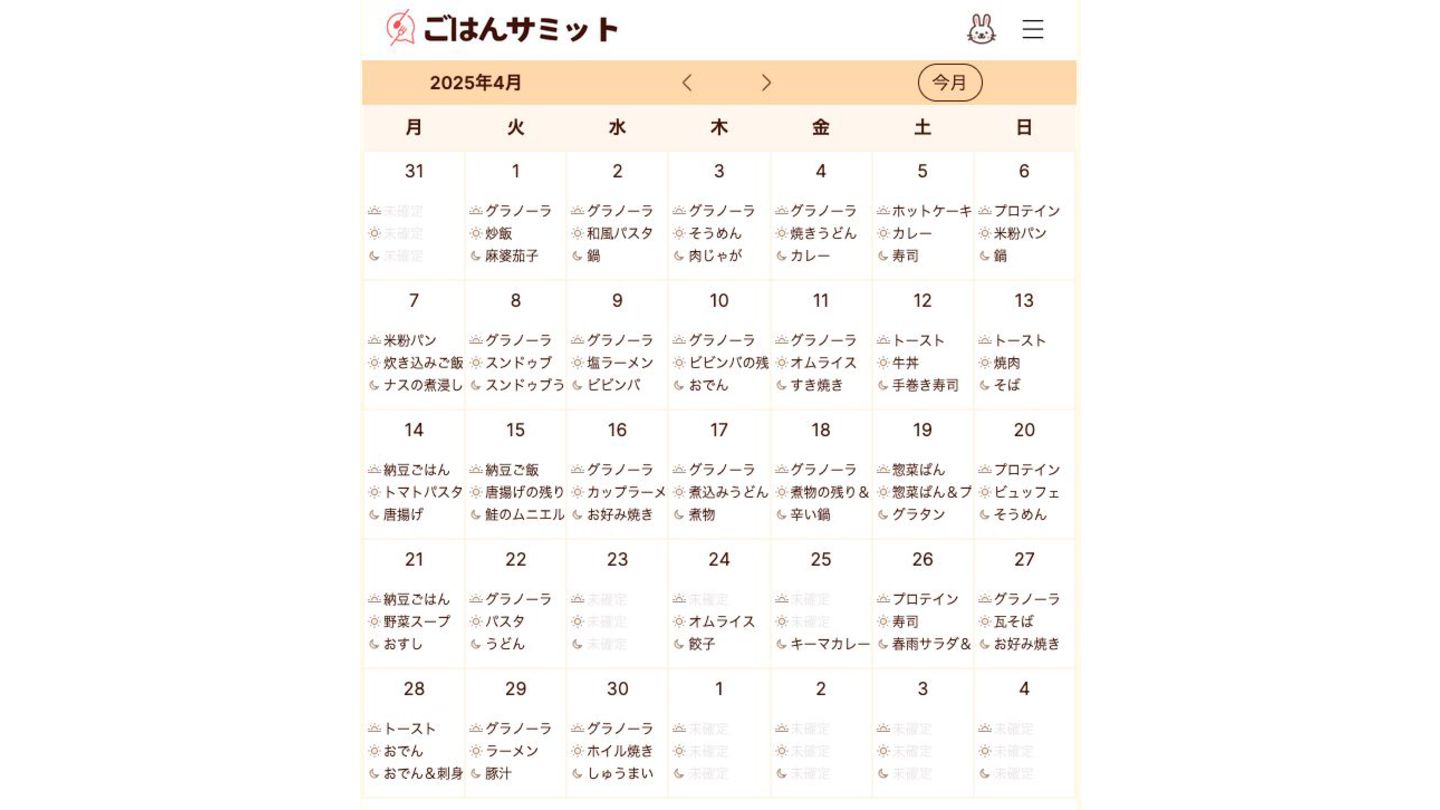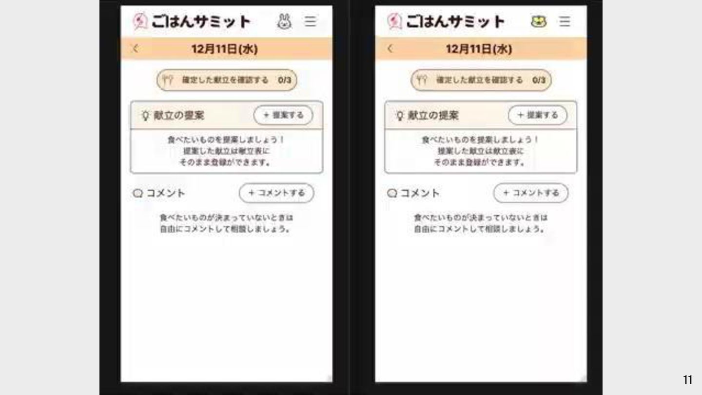 左:日付 中央:献立 右:会議室の様子 🍴:登録済み献立の数 💡:提案の数 💬:コメントの数 献立表