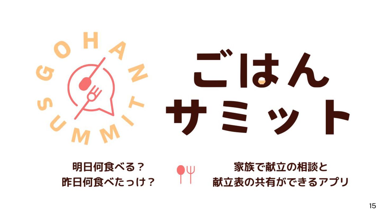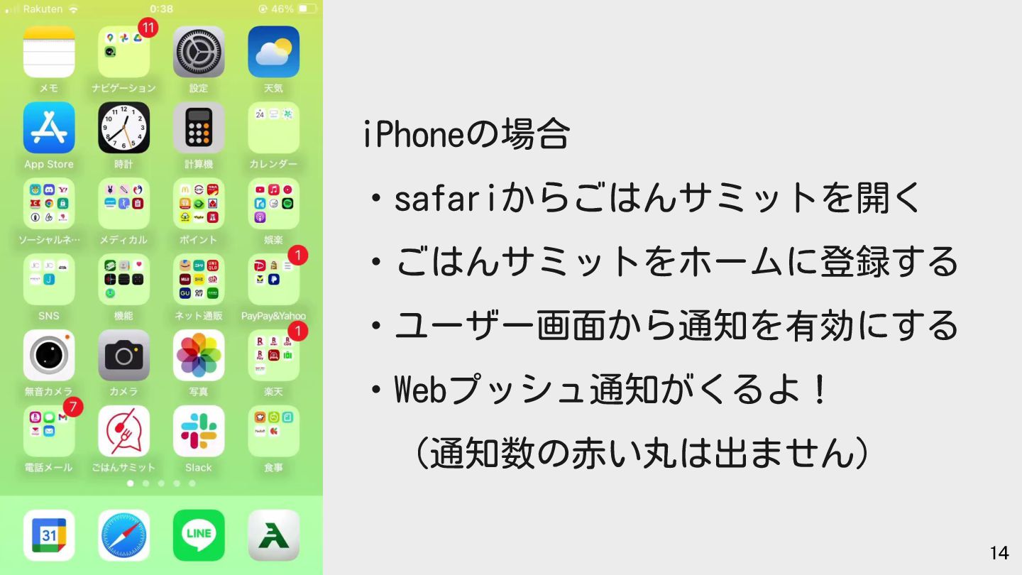 14 iPhoneの場合 ・safariからごはんサミットを開く ・ごはんサミットをホームに登録する ・ユーザー画面から通知を有効にする ・Webプッシュ通知がくるよ! (通知数の赤い丸は出ません)