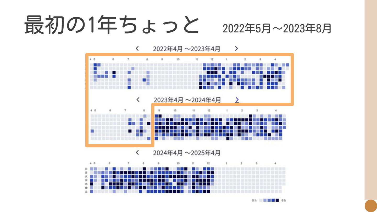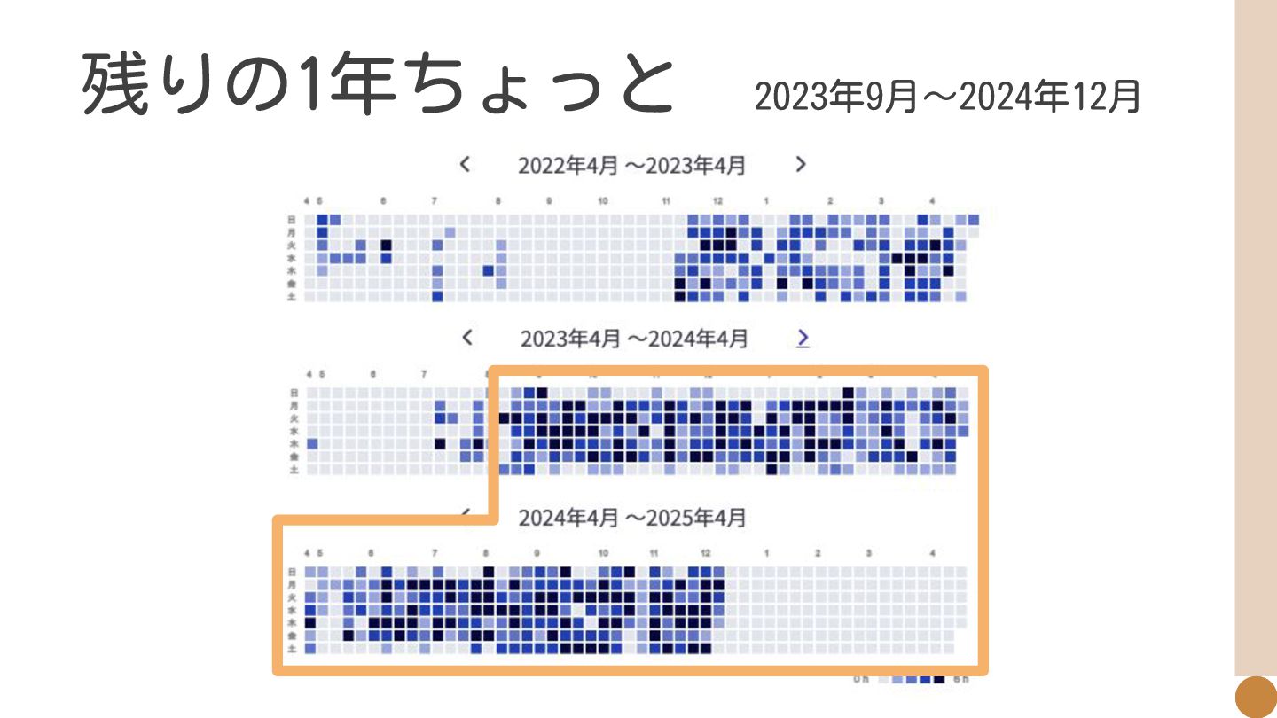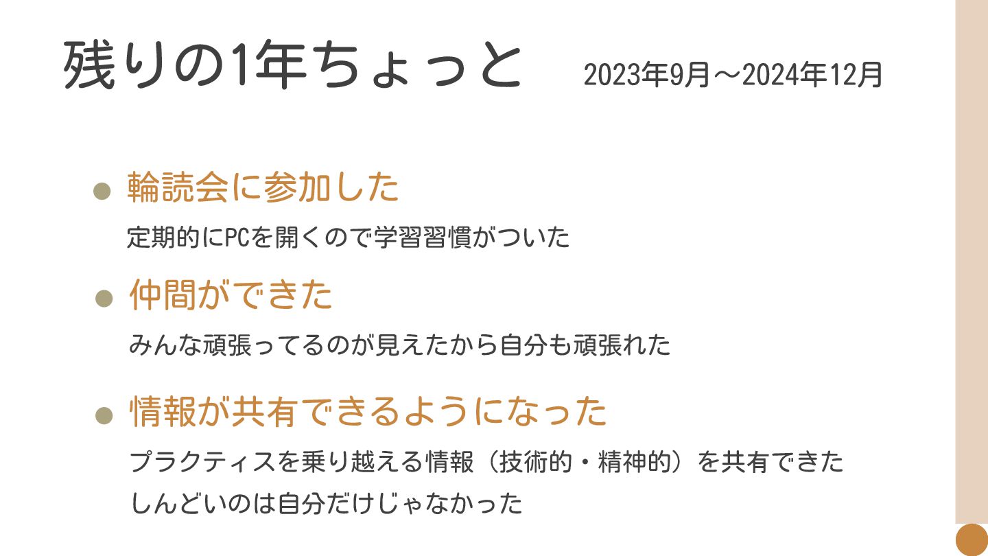 定期的にPCを開くので学習習慣がついた 輪読会に参加した 残りの1年ちょっと 2023年9月〜2024年12月 みんな頑張ってるのが見えたから自分も頑張れた 仲間ができた プラクティスを乗り越える情報(技術的・精神的)を共有できた しんどいのは自分だけじゃなかった 情報が共有できるようになった
