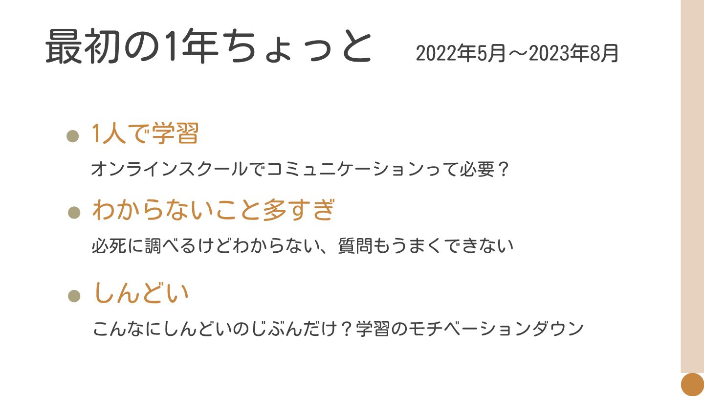 オンラインスクールでコミュニケーションって必要? 1人で学習 最初の1年ちょっと 2022年5月〜2023年8月 必死に調べるけどわからない、質問もうまくできない わからないこと多すぎ こんなにしんどいのじぶんだけ?学習のモチベーションダウン しんどい