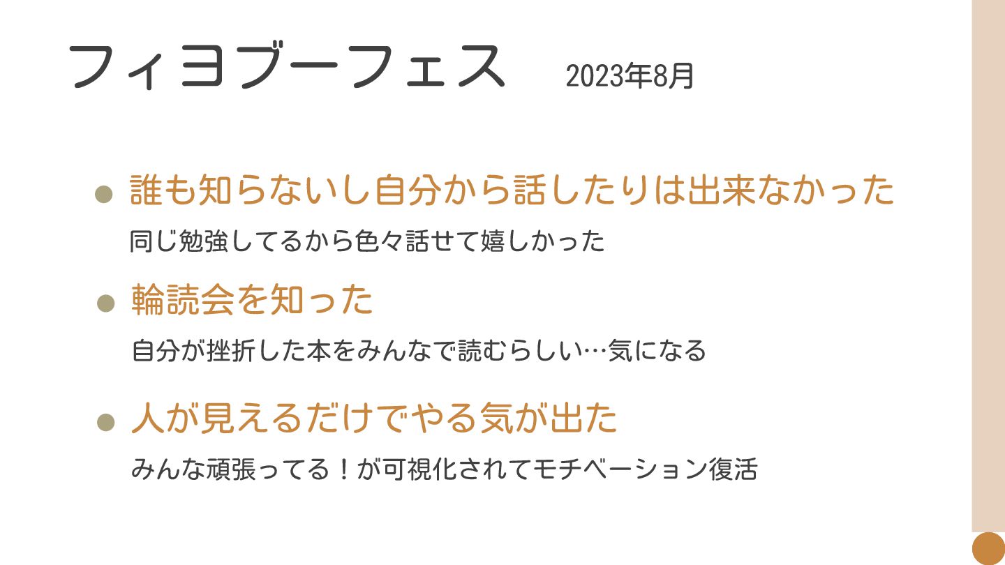 同じ勉強してるから色々話せて嬉しかった 誰も知らないし自分から話したりは出来なかった フィヨブーフェス 2023年8月 自分が挫折した本をみんなで読むらしい…気になる 輪読会を知った みんな頑張ってる!が可視化されてモチベーション復活 人が見えるだけでやる気が出た