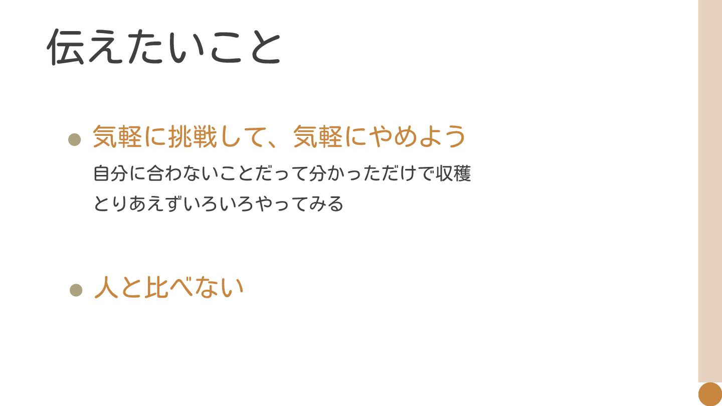 自分に合わないことだって分かっただけで収穫 とりあえずいろいろやってみる 気軽に挑戦して、気軽にやめよう 伝えたいこと 人と比べない