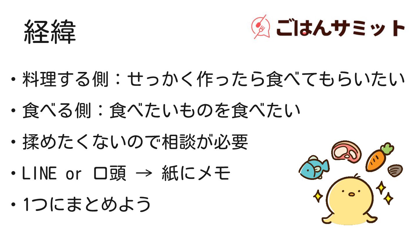 ・料理する側:せっかく作ったら食べてもらいたい ・食べる側:食べたいものを食べたい ・揉めたくないので相談が必要 ・LINE or 口頭 → 紙にメモ ・1つにまとめよう 経緯