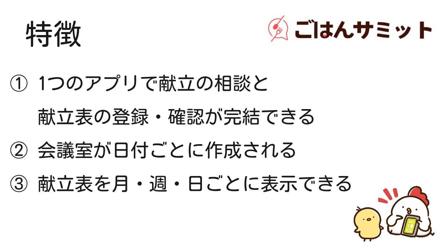 ① 1つのアプリで献立の相談と 献立表の登録・確認が完結できる ② 会議室が日付ごとに作成される ③ 献立表を月・週・日ごとに表示できる 特徴