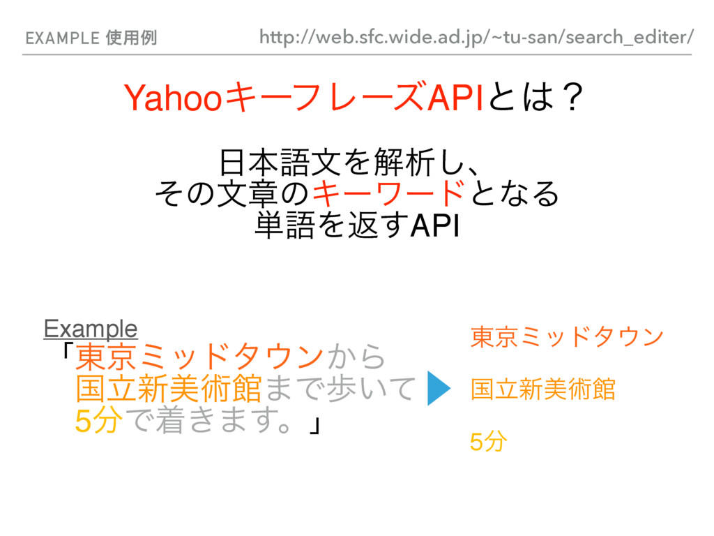 EXAMPLE ༻ྫ YahooΩʔϑϨʔζAPIͱʁ ຊޠจΛղੳ͠ɺ ͦͷจষͷΩʔϫʔυͱͳΔ ୯ޠΛฦ͢API Example ʮ౦ژϛουλϯ͔Β ɹࠃཱ৽ඒज़ؗ·Ͱา͍ͯ ɹ5Ͱண͖·͢ɻʯ