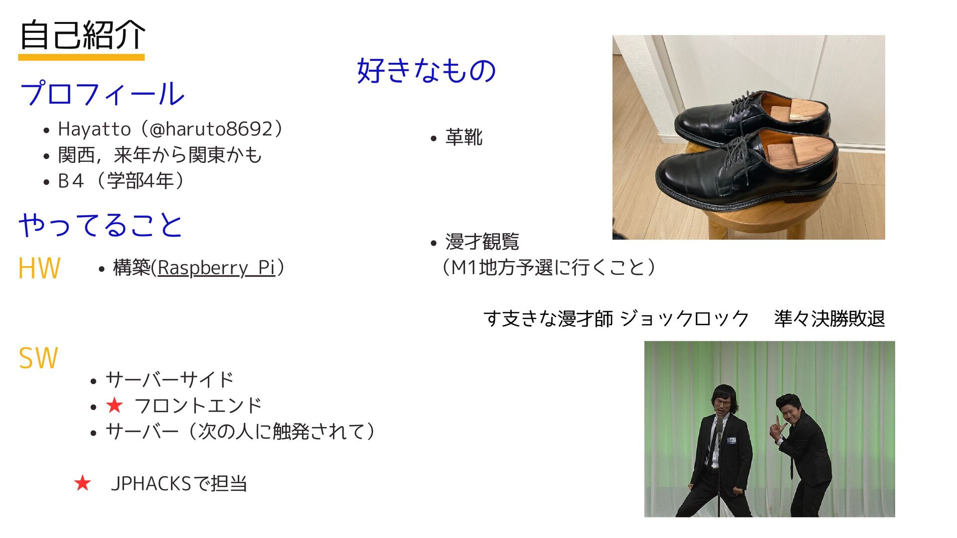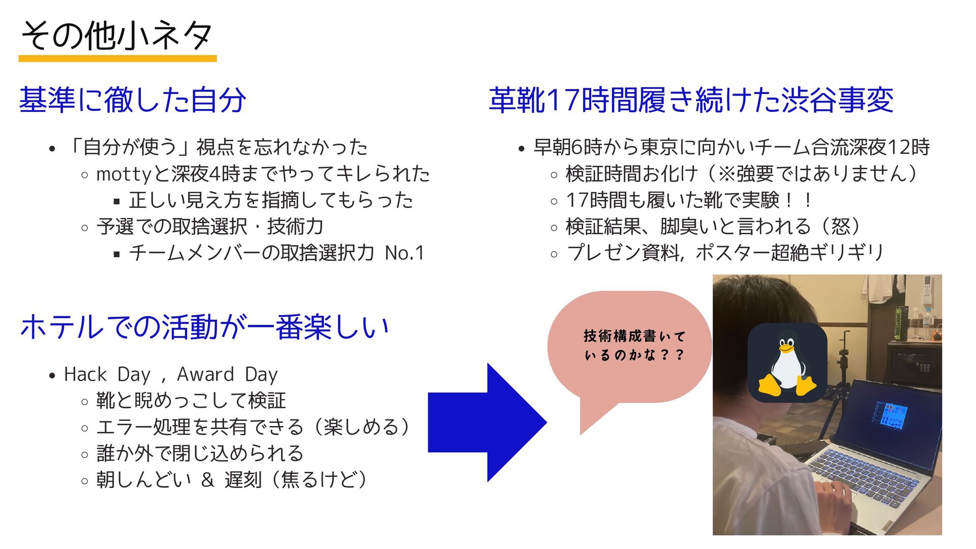 遅刻(焦るけど) その他小ネタ ホテルでの活動が一番楽しい 「自分が使う」視点を忘れなかった mottyと深夜4時までやってキレられた 正しい見え方を指摘してもらった 予選での取捨選択・技術力 チームメンバーの取捨選択力 No.1 基準に徹した自分 早朝6時から東京に向かいチーム合流深夜12時 検証時間お化け(※強要ではありません) 17時間も履いた靴で実験!! 検証結果、脚臭いと言われる(怒) プレゼン資料, ポスター超絶ギリギリ 革靴17時間履き続けた渋谷事変 技術構成書いて いるのかな??