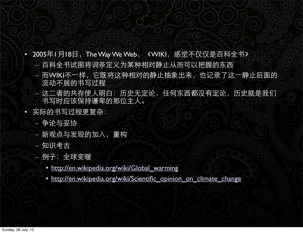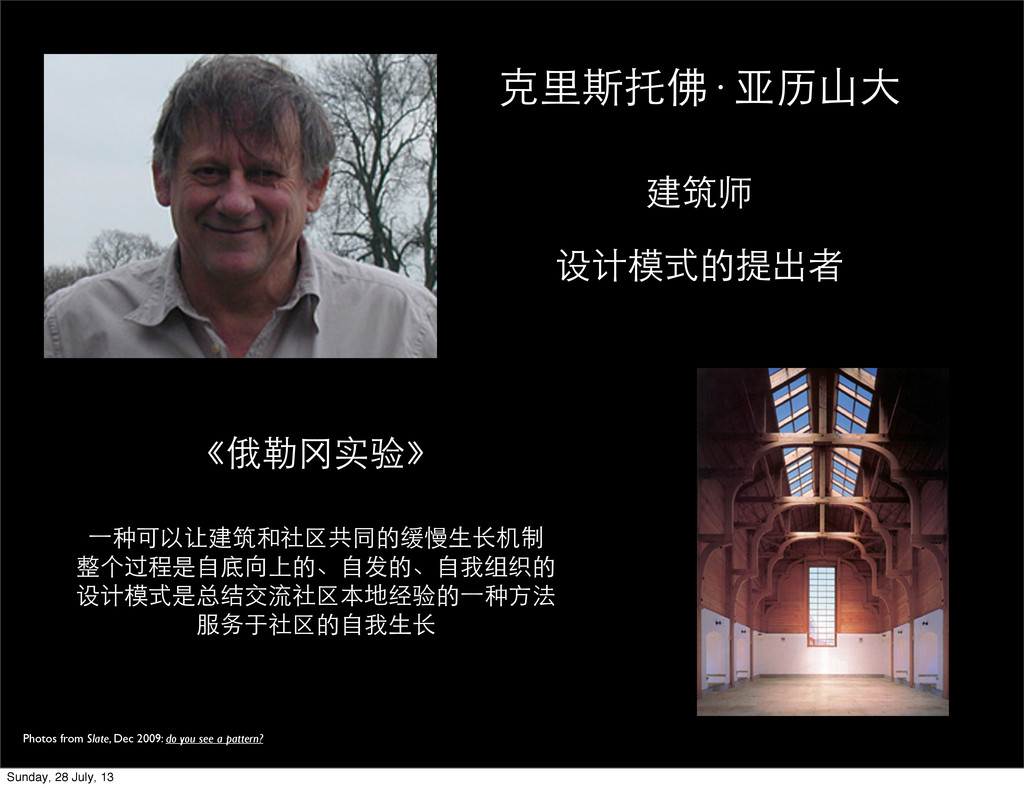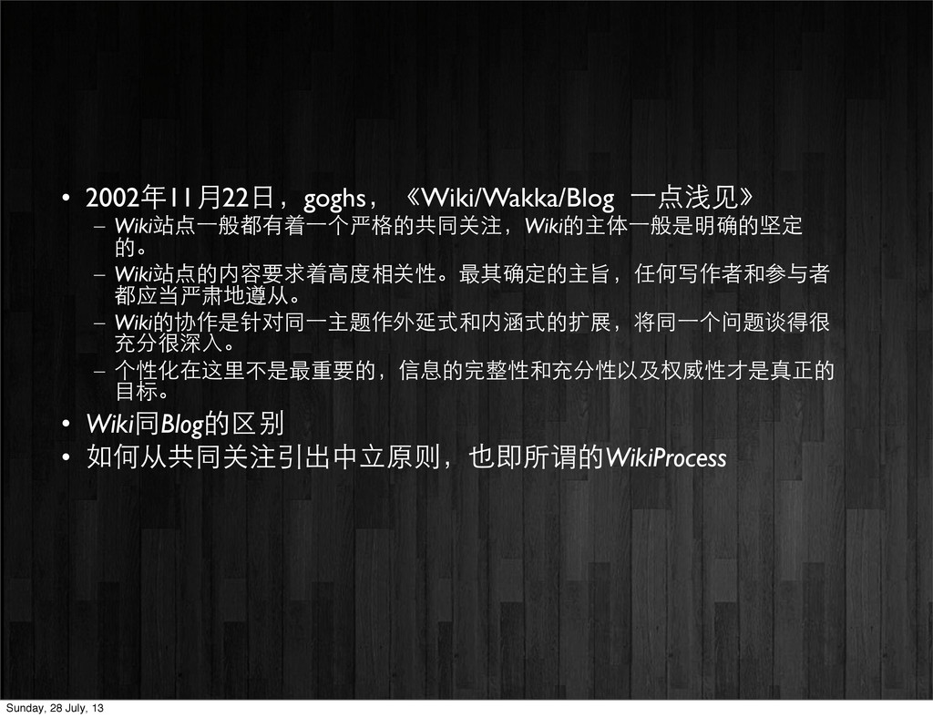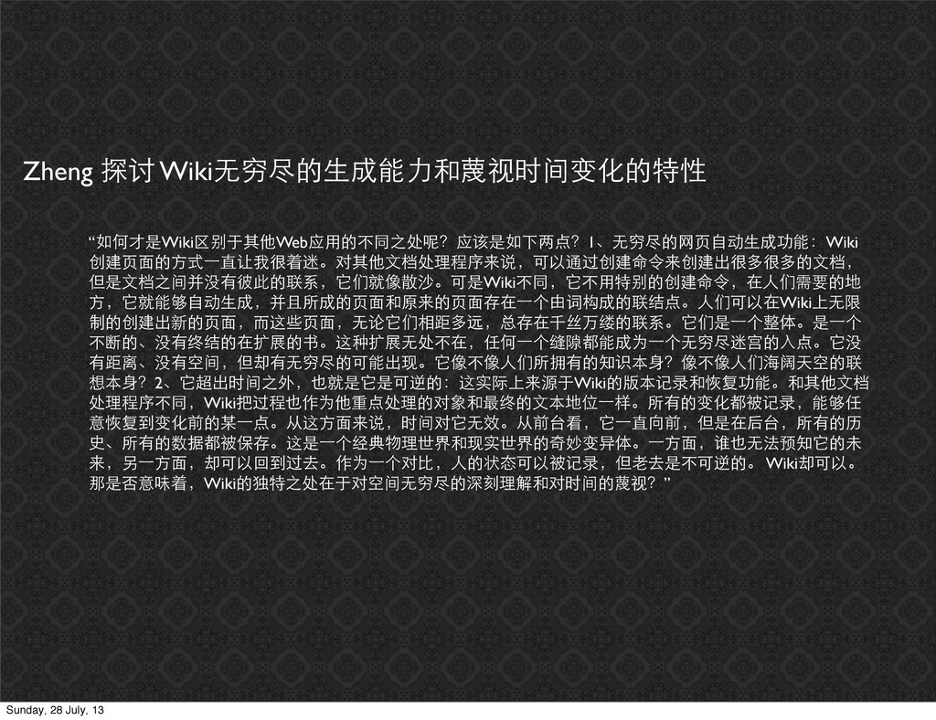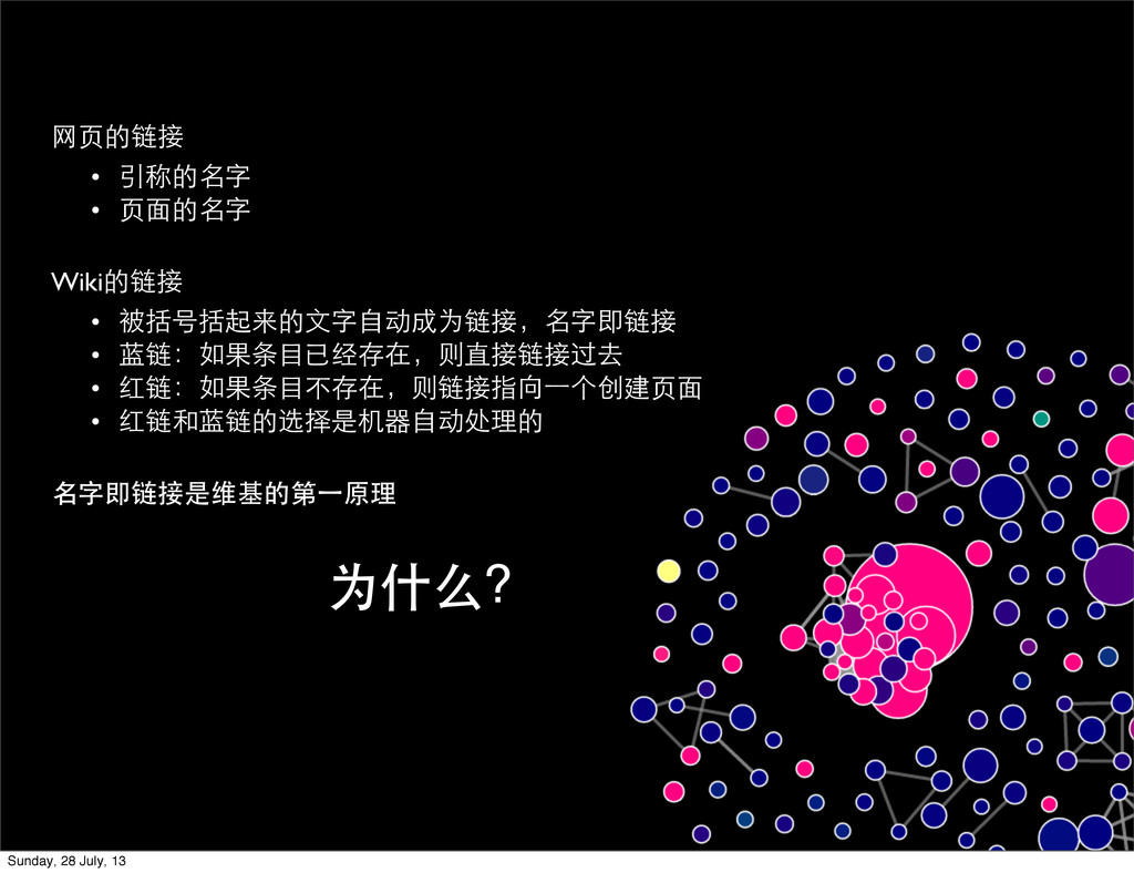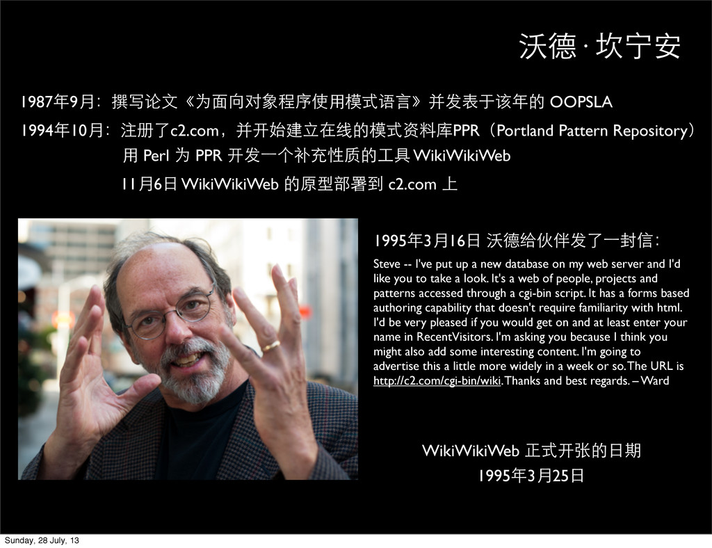 PPR 开发⼀一个补充性质的⼯工具 WikiWikiWeb 11月6⽇日 WikiWikiWeb 的原型部署到 c2.com 上 1995年3月16⽇日 沃德给伙伴发了⼀一封信: Steve -- I've put up a new database on my web server and I'd like you to take a look. It's a web of people, projects and patterns accessed through a cgi-bin script. It has a forms based authoring capability that doesn't require familiarity with html. I'd be very pleased if you would get on and at least enter your name in RecentVisitors. I'm asking you because I think you might also add some interesting content. I'm going to advertise this a little more widely in a week or so. The URL is http://c2.com/cgi-bin/wiki. Thanks and best regards. – Ward WikiWikiWeb 正式开张的⽇日期 1995年3月25⽇日 Sunday, 28 July, 13