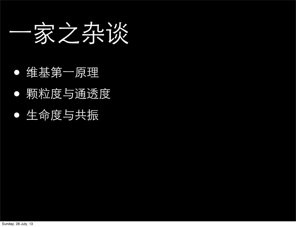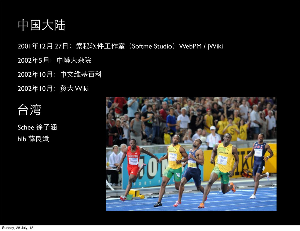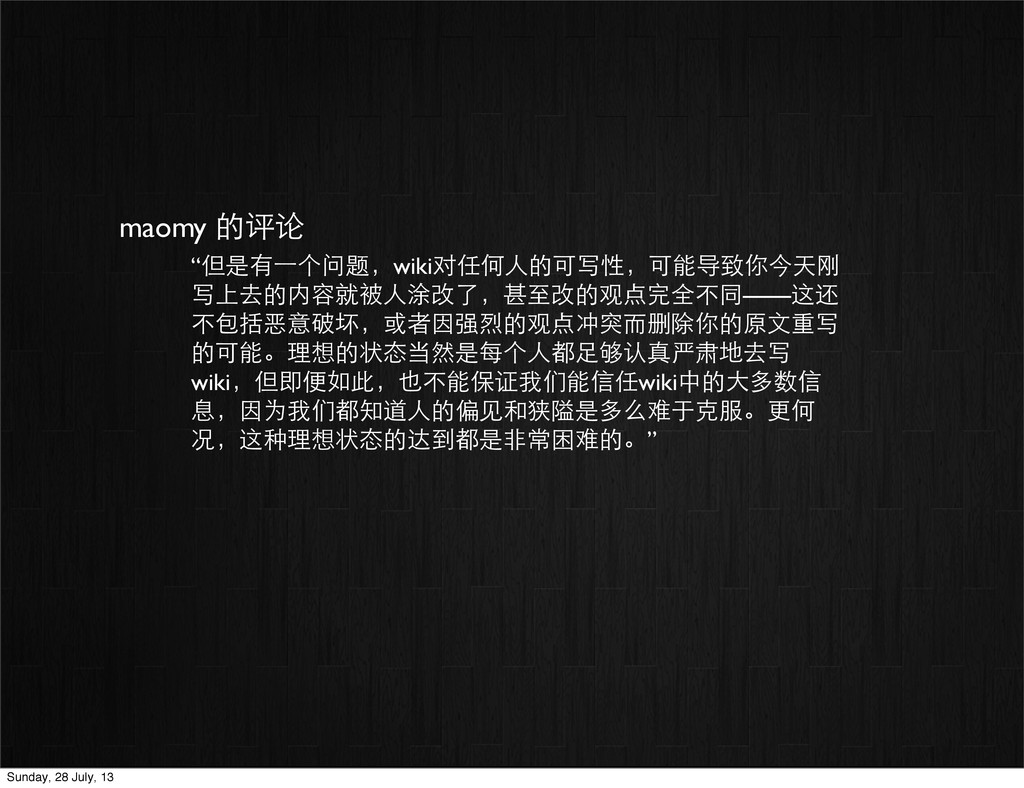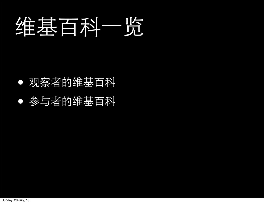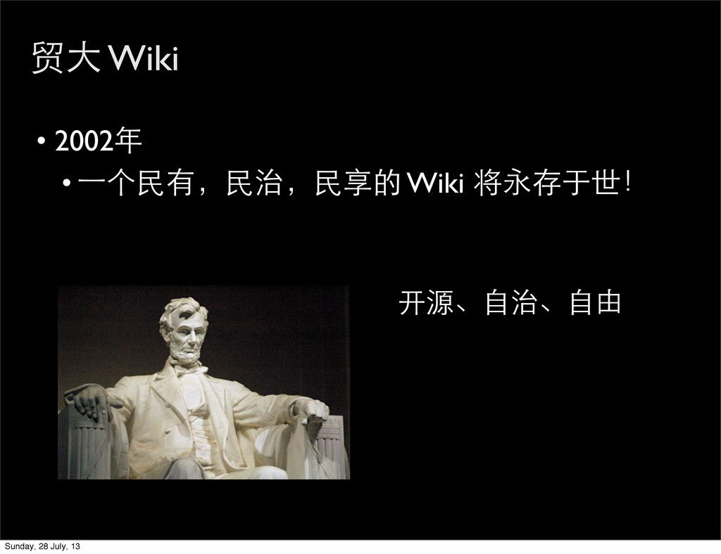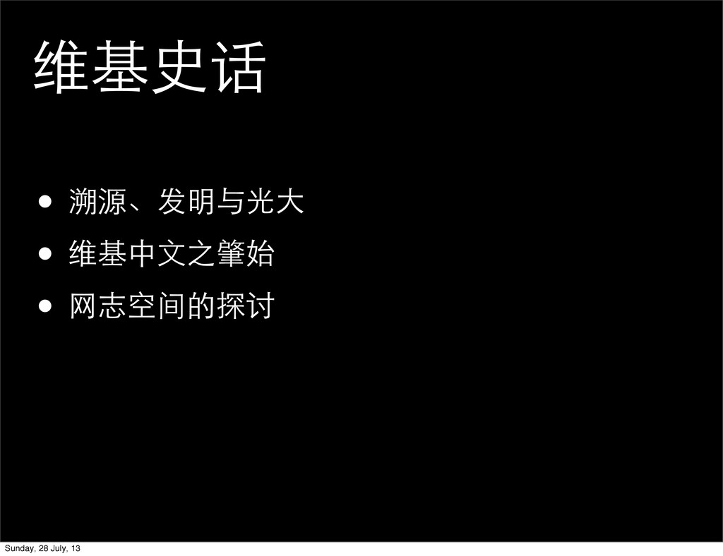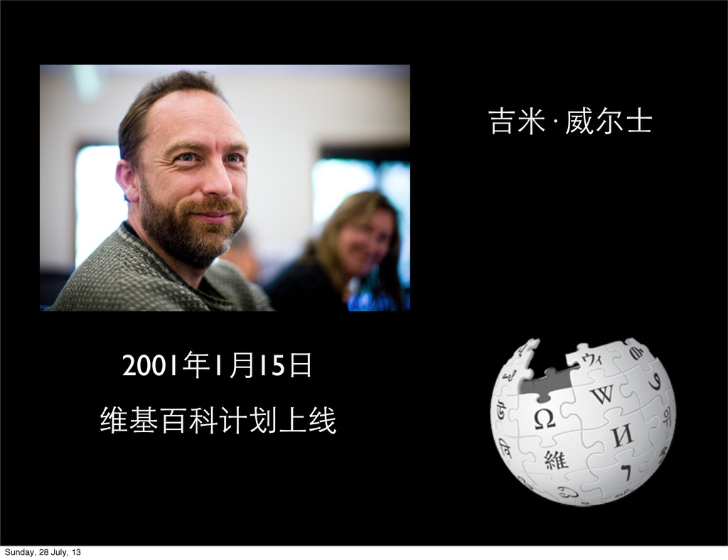 PPR 开发⼀一个补充性质的⼯工具 WikiWikiWeb 11月6⽇日 WikiWikiWeb 的原型部署到 c2.com 上 1995年3月16⽇日 沃德给伙伴发了⼀一封信: Steve -- I've put up a new database on my web server and I'd like you to take a look. It's a web of people, projects and patterns accessed through a cgi-bin script. It has a forms based authoring capability that doesn't require familiarity with html. I'd be very pleased if you would get on and at least enter your name in RecentVisitors. I'm asking you because I think you might also add some interesting content. I'm going to advertise this a little more widely in a week or so. The URL is http://c2.com/cgi-bin/wiki. Thanks and best regards. – Ward WikiWikiWeb 正式开张的⽇日期 1995年3月25⽇日 Sunday, 28 July, 13