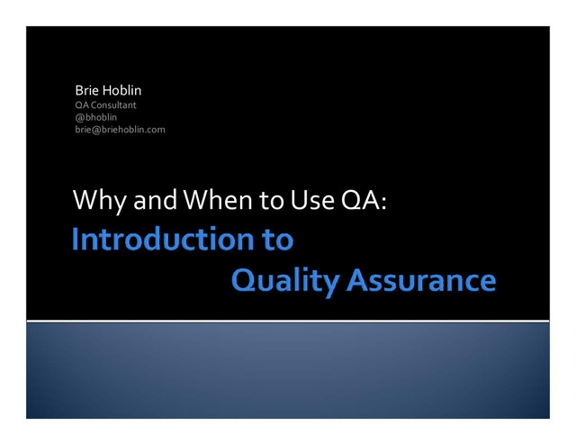 In this talk we’ll discuss the principles of QA and the value of QA for all stakeholders. We will begin by defining QA, some basic vocabulary, and discussing when & why it is needed as part of the SDLC. The discussion will cover the benefits of using QA, comparisons of automated and manual testing and when each is appropriate, and does it really cut costs?