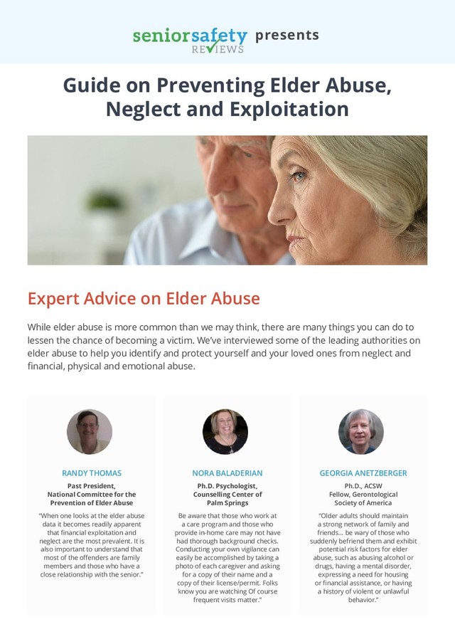 be aware and stay involved in the management of their financial affairs Neglect and Deprivation Neglect is one of the most common forms of elder abuse. It includes failure to provide for an elder’s basic care including food, clothing, hygiene, social, mental and physical stimulation, medical care, physical assistance and therapeutic devices. Sometimes it’s willful and intentional, other times it’s a result of family caregivers inadvertently neglecting a loved one due to their own lack of knowledge, expertise, maturity or resources. Warning signs of elder neglect and deprivation: • Has poor hygiene (dirty bedding and clothing, unbrushed hair, infrequent showering, etc...) • Develops bed sores and skin rashes • Unusual weight loss • Inappropriate clothing for the season • Not using needed eyeglasses, dentures, hearing aids, commodes, canes, or walkers • Poor living conditions (clutter, dirty, no heat, electricity, running water) • Letting medical ailments go untreated • Medications go unused, prescriptions do not get filled • The caregiver limits outside contact with the senior • Change in mood, alertness or behavior of the senior Preventing elder neglect and deprivation: • Frequent check-ups on the elder, both calls and visits • Use “nanny” cams to ensure caregivers are performing responsibilities • Make calls with video chat, so you can see the physical condition of the elder • Do background and reference checks on hired caregivers • Make sure caregivers have no history of drug or alcohol addiction Physical Abuse Physical abuse occurs when the perpetrator inflicts physical pain or injury on an older adult. Physical abuse can range from slapping, pinching, shoving and grabbing to punching, throwing and restraining with ropes and chains. It can also include the inapropriate use of medications. Even if the motivation is to protect the elder, if the pain or injury is unnecessary it can be considered abusive. Warning signs of elder physical abuse: • Bruises, pressure marks, scratches, burns, broken bones, sprains, pulled out hair, tooth loss, internal injuries, dislocations • Unreasonable or no explanation for physical injuries • Signs of force feeding • Signs of restraints on wrists or ankles • Broken glasses • Visit to different emergency rooms to treat injuries to avoid detection of pattern of abuse • The victim treats their own injuries, to avoid bringing attention