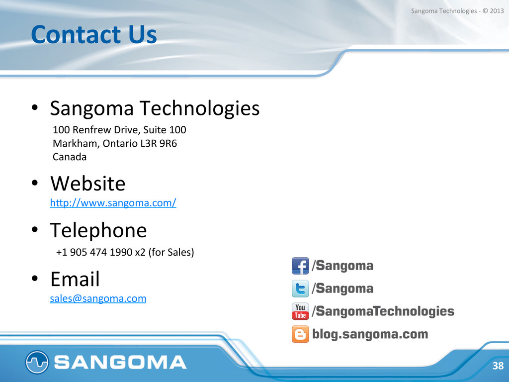 Suite 100 Markham, Ontario L3R 9R6 Canada • Website hop://www.sangoma.com/ • Telephone +1 905 474 1990 x2 (for Sales) • Email