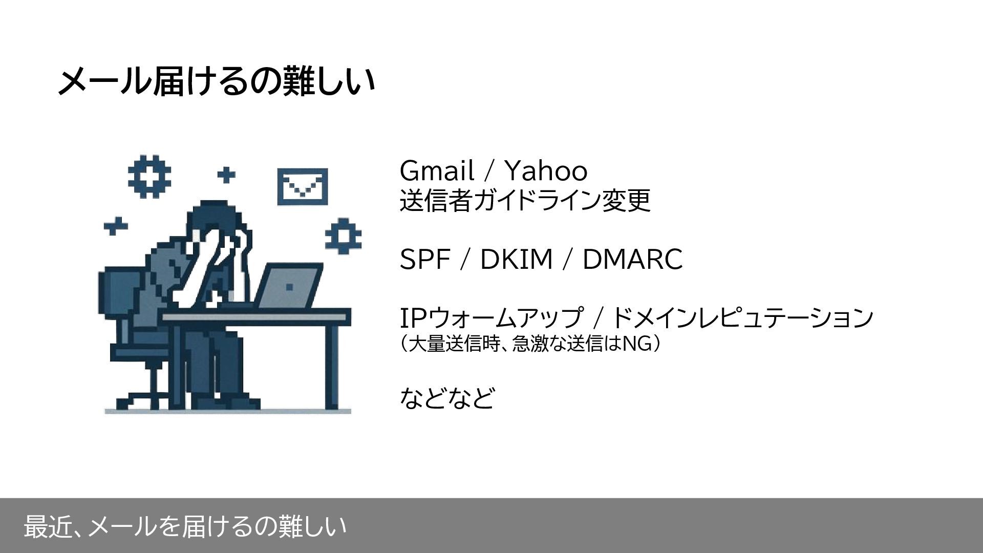 最近、メールを届けるの難しい メール届けるの難しい Gmail / Yahoo 送信者ガイドライン変更 SPF / DKIM /