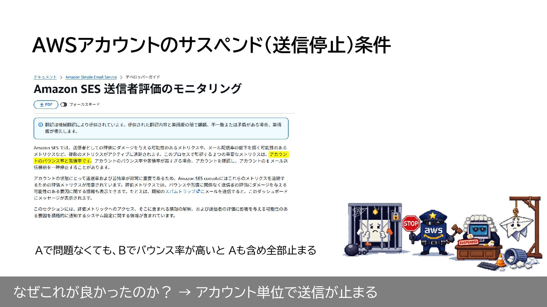 なぜこれが良かったのか? → アカウント単位で送信が止まる AWSアカウントのサスペンド(送信停止)条件 Aで問題なくても、Bでバウンス率が高いと Aも含め全部止まる