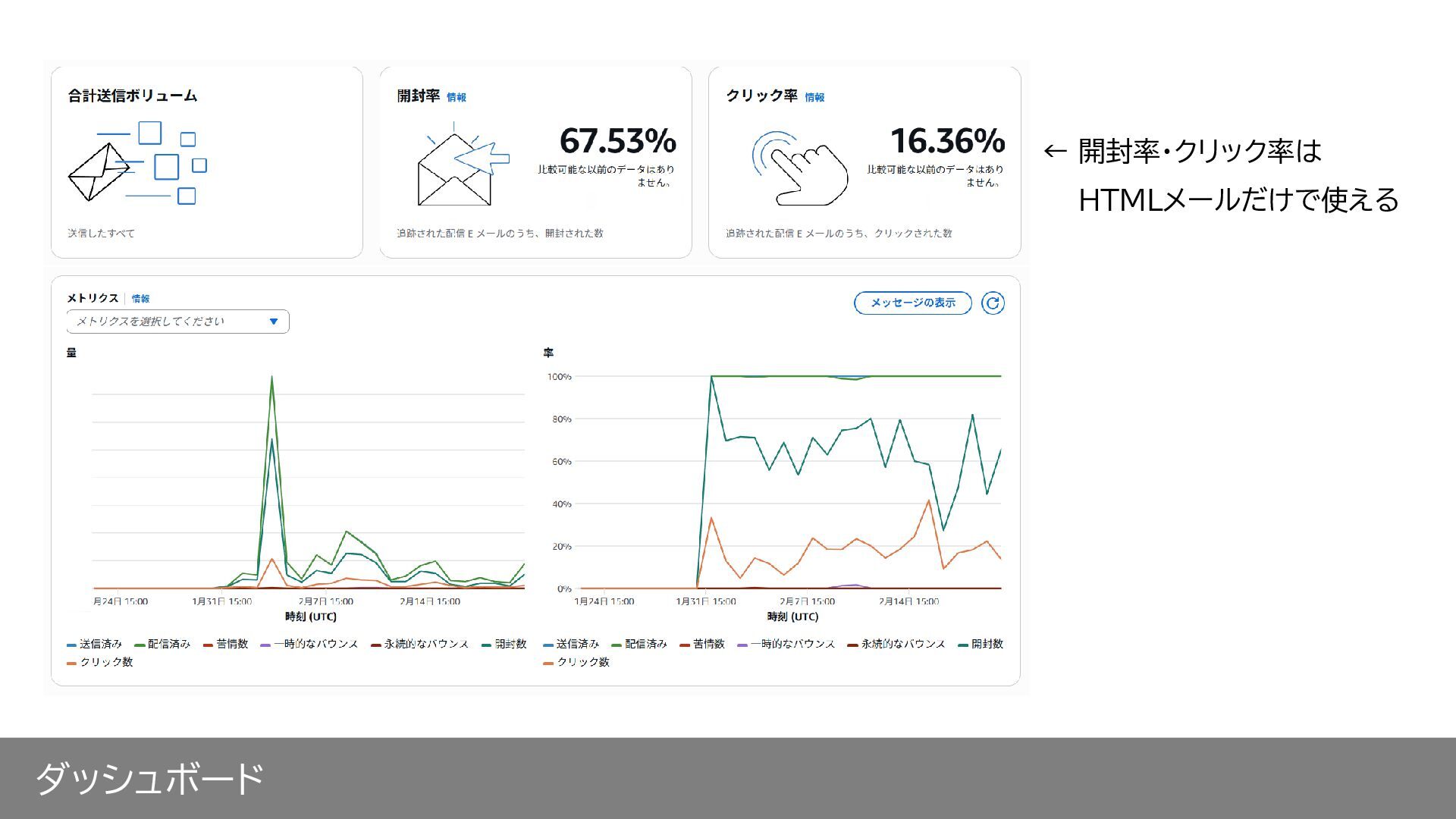 ダッシュボード あ ← 開封率・クリック率は HTMLメールだけで使える