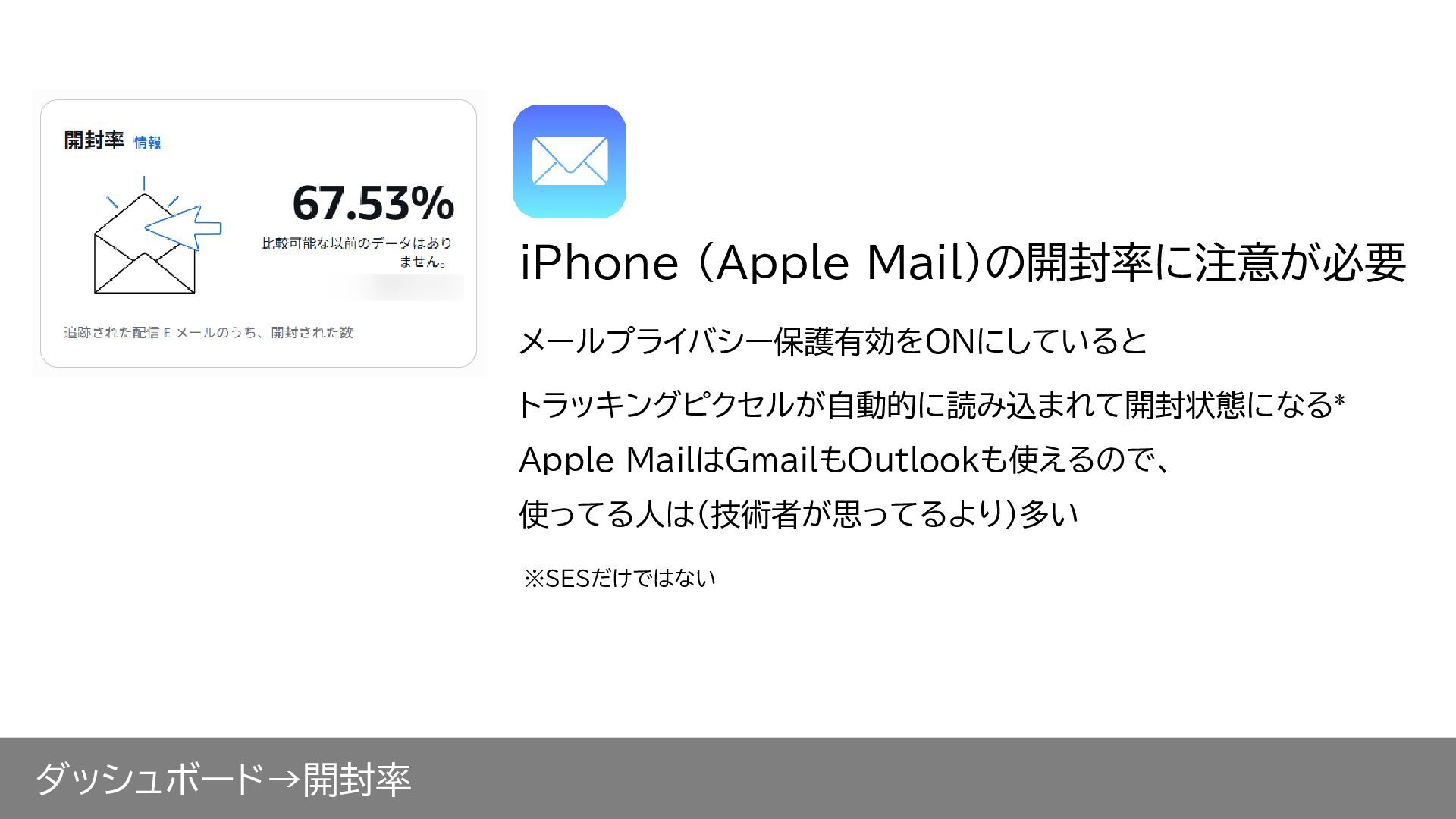 ダッシュボード→開封率 iPhone (Apple Mail)の開封率に注意が必要 メールプライバシー保護有効をONにしていると トラッキングピクセルが自動的に読み込まれて開封状態になる* Apple MailはGmailもOutlookも使えるので、 使ってる人は(技術者が思ってるより)多い ※SESだけではない