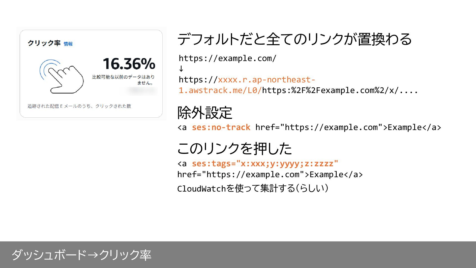 ダッシュボード→クリック率 除外設定 <a ses:no-track href="https://example.com">Example</a> このリンクを押した <a ses:tags="x:xxx;y:yyyy;z:zzzz" href="https://example.com">Example</a> CloudWatchを使って集計する(らしい)