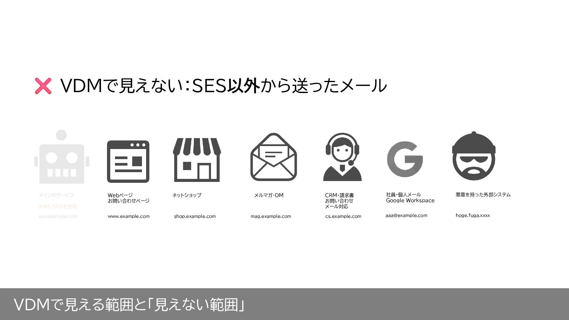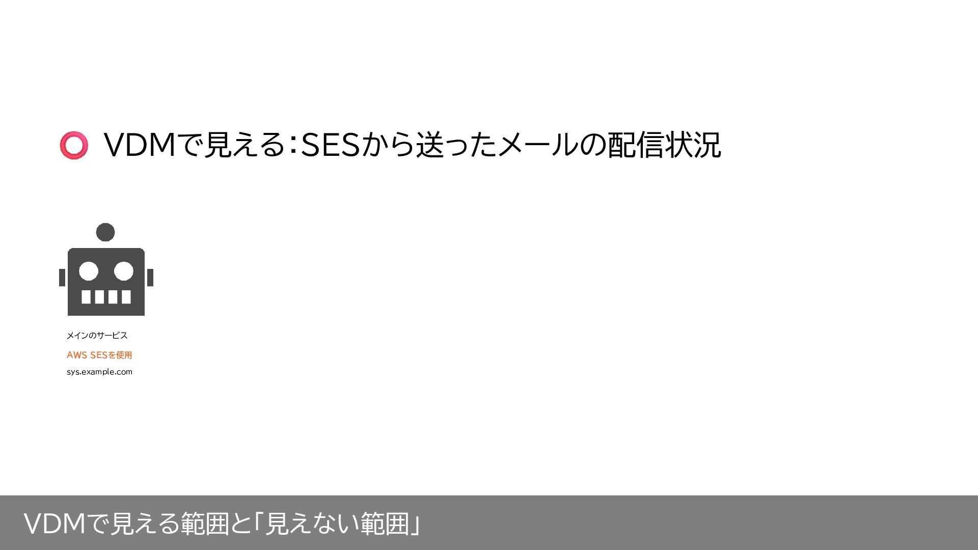VDMで見える範囲と「見えない範囲」 VDMで見える:SESから送ったメールの配信状況 メインのサービス AWS SESを使用 sys.example.com