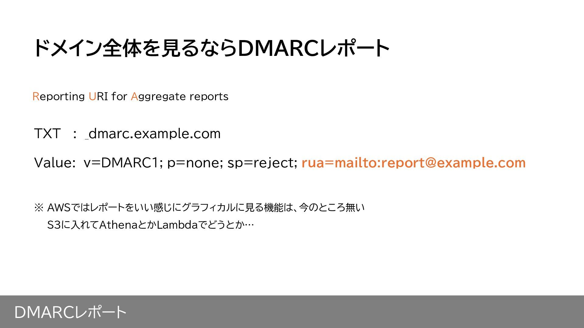 AWSではレポートをいい感じにグラフィカルに見る機能は、今のところ無い S3に入れてAthenaとかLambdaでどうとか… ドメイン全体を見るならDMARCレポート Reporting URI for Aggregate reports