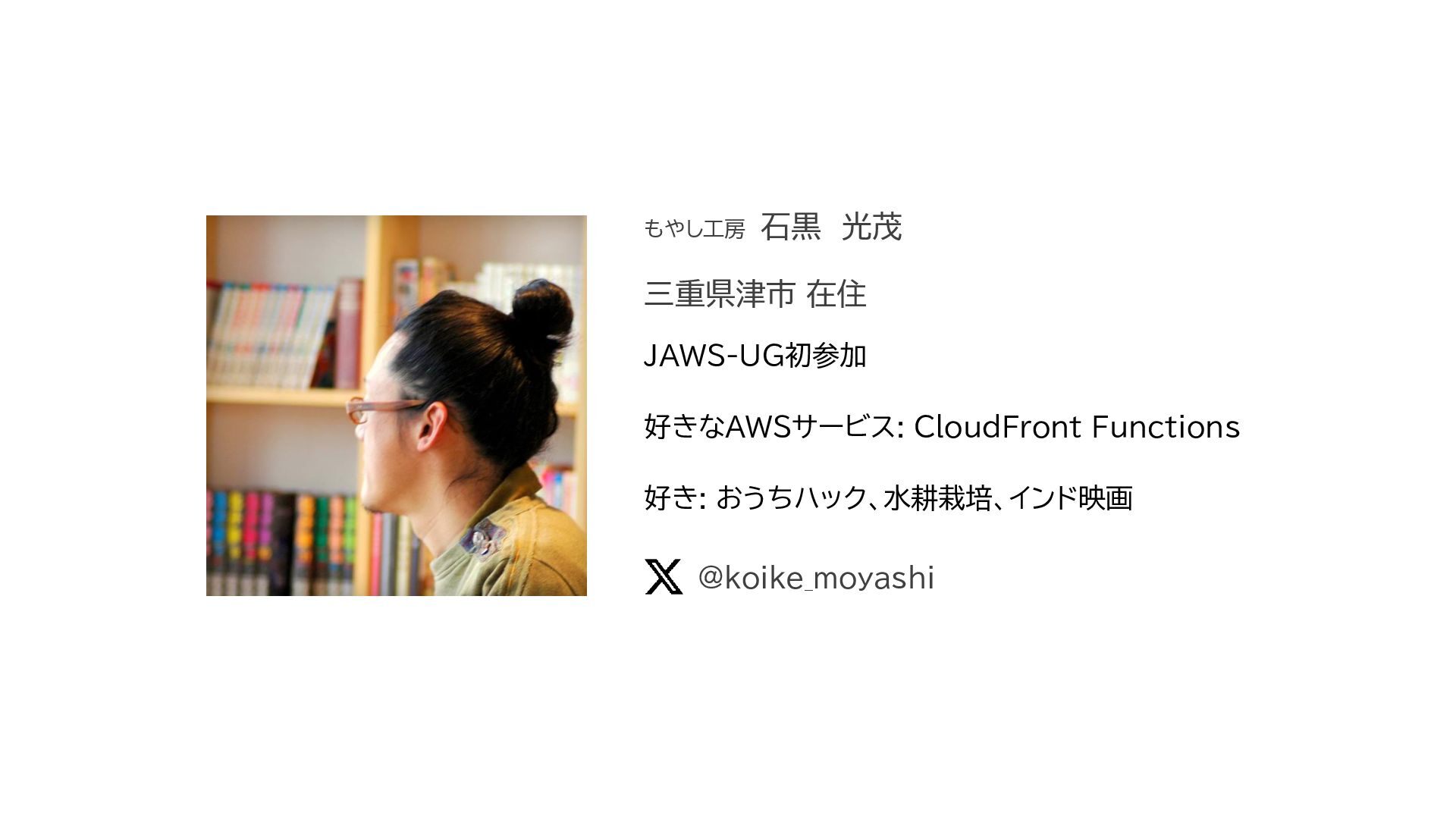 もやし工房 石黒 光茂 @koike_moyashi 好きなAWSサービス: CloudFront Functions JAWS-UG初参加 三重県津市 在住