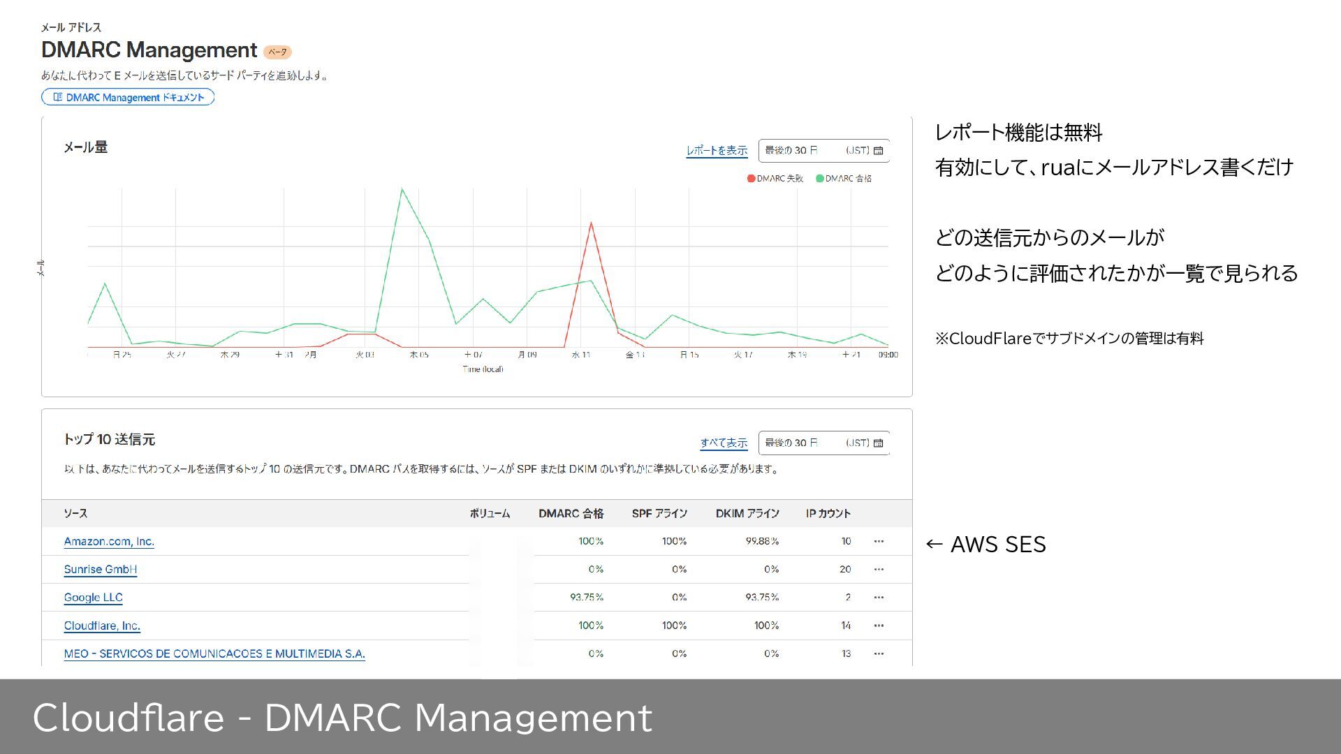 Cloudflare - DMARC Management ← AWS SES レポート機能は無料 有効にして、ruaにメールアドレス書くだけ どの送信元からのメールが
