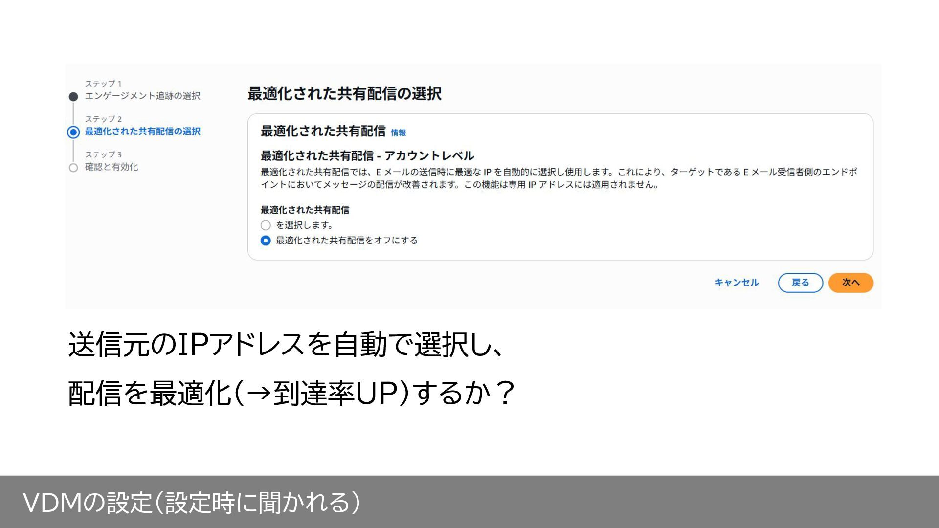 VDMの設定(設定時に聞かれる) あ 送信元のIPアドレスを自動で選択し、 配信を最適化(→到達率UP)するか?