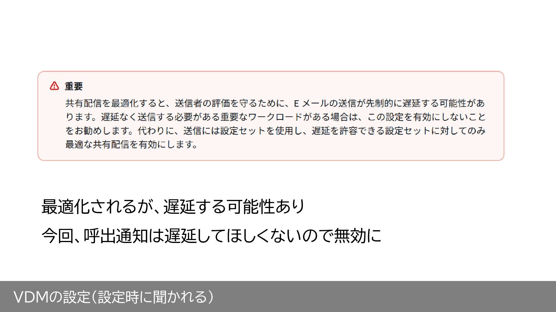 VDMの設定(設定時に聞かれる) 最適化されるが、遅延する可能性あり 今回、呼出通知は遅延してほしくないので無効に