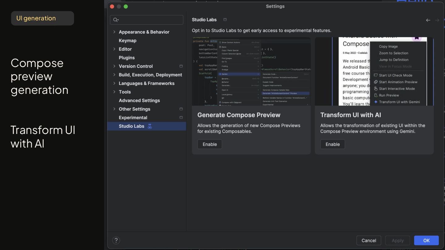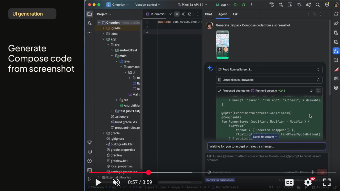 I also dived into its UI-focused capabilities: instantly turning visual designs and screenshots into production-ready Jetpack Compose code, transforming UIs with natural language commands in the Compose Preview, generating previews with realistic sample data, and even suggesting accessibility fixes or adaptive layouts.