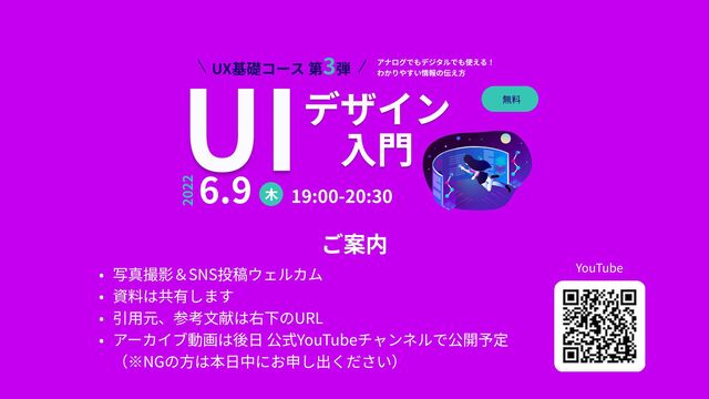 ・UIとは ・デザインとは ・デザインの敗北・BADUI ・デザインの4原則(近接・整列・反復・コントラスト) ・ワークショップ(バナー改善) ・まとめ - UI(インターフェース)とは、セカイとユーザーの境界面 - UXの中でも「使う」の領域を担う - デザインとは、課題解決を目的とした工夫 - デザインの4大原則は「近接・整列・反復・コントラスト」