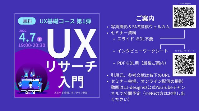 w 60分/90分調査の時間配~ w 無料でインタビュー協力者を集める方{ w アンケート設計方{ w 調査モデレートテクニッ w 会場設営、機器、文字起こしツール等のF w 個人情報データの扱い、セキュリテB w 初対面でのラポール(調和関係)形6 w 実録!インタビュー事件簿 w UXリサーチャーの仕ì w レベチな本気没入リサーæ w UXリサーチを組織に導入するステッß w 利害関係者とのコミュニケーションÆ w プロトタイピングとÖ w 業務システムのUXリサーæ w 定性 / 定量 のUXリサーチツー° w 認知バイアスの注意 w 心理学・認知科学・行動経済学のF w 判断スイッチをOFFるトレーニング方{ w リサーチ結果の分析方{ w (任意)個別フィードバック ※希望者はご相談ください